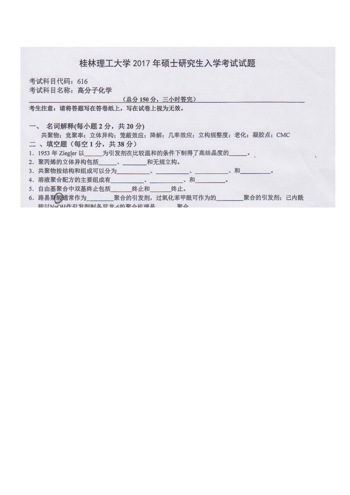桂林理工大学616高分子化学2017年真题