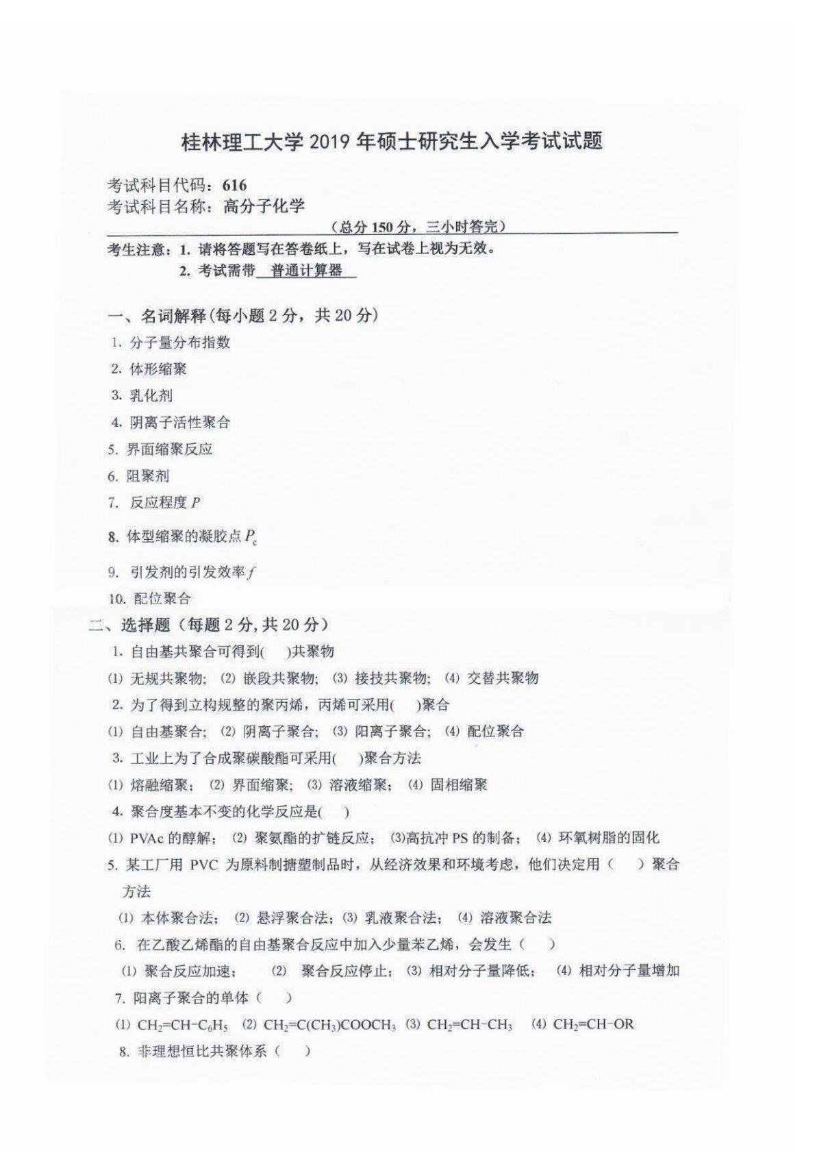 桂林理工大学616高分子化学2019年真题