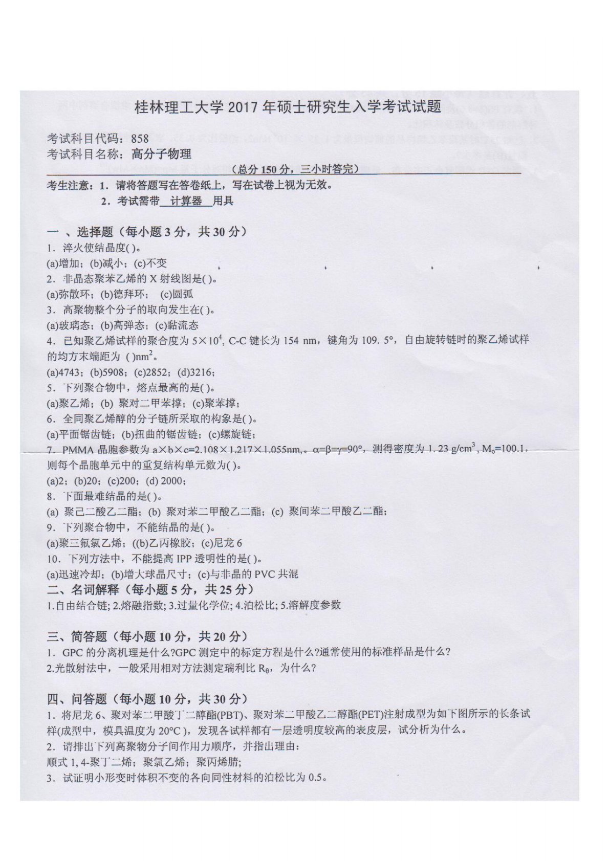 桂林理工大学858高分子物理2017年真题
