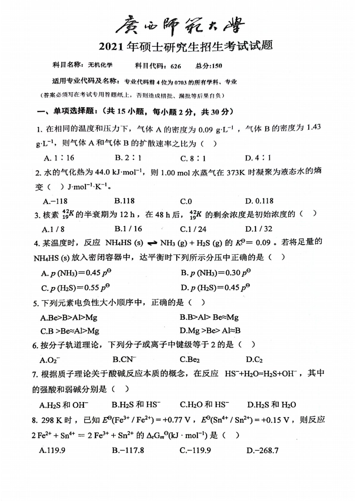 广西师范大学626无机化学2021年真题