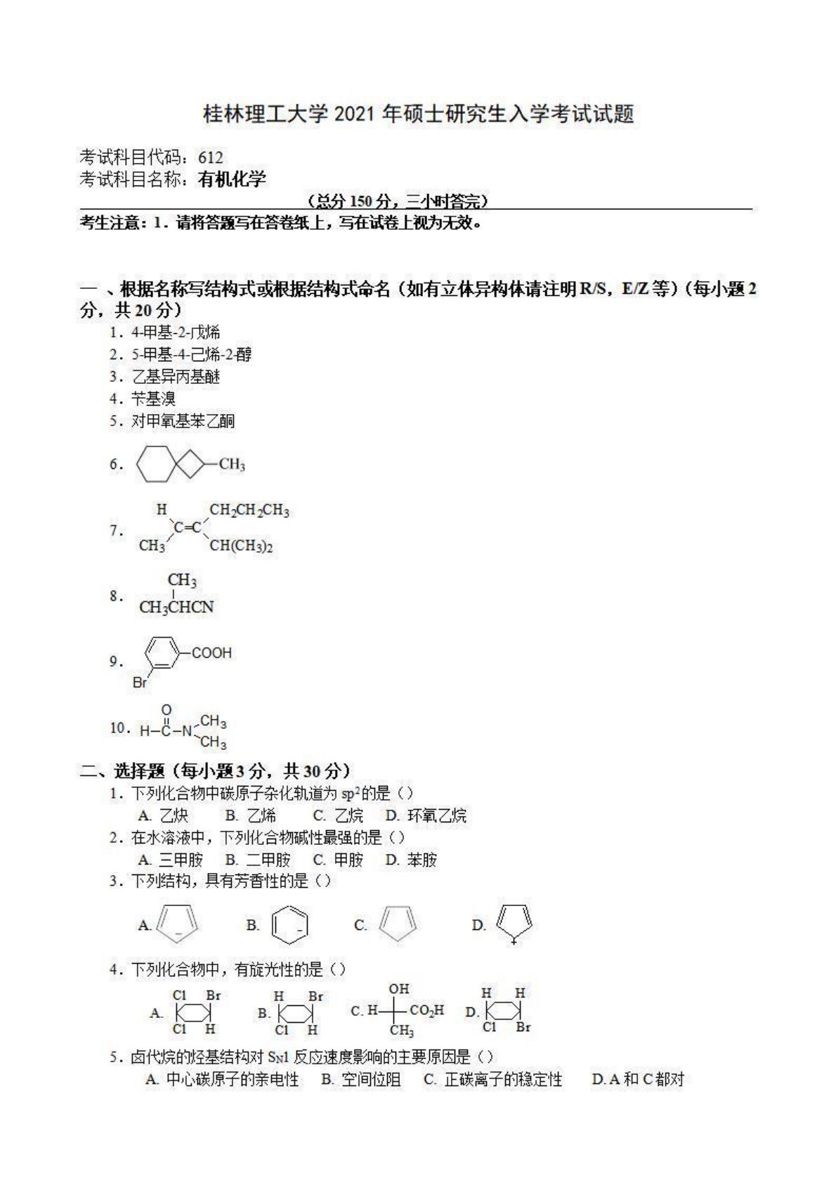 桂林理工大学612有机化学2021年真题