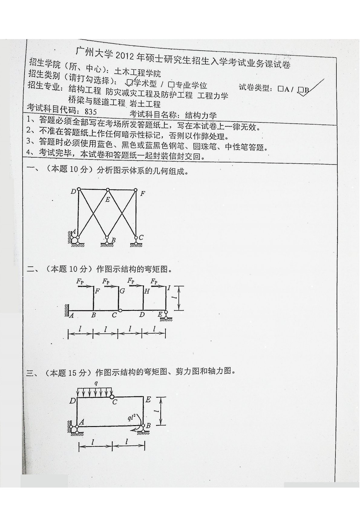 广州大学839结构力学(学硕)2012年真题