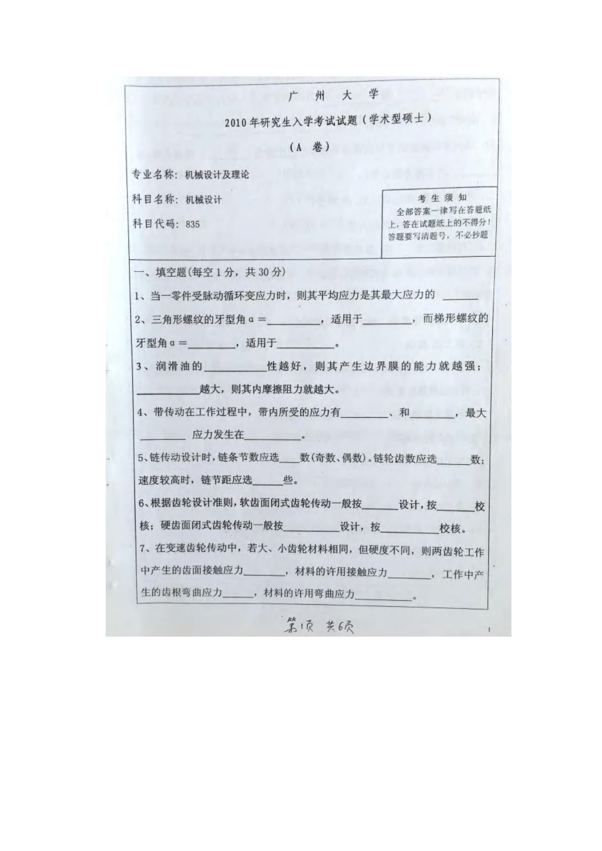 广州大学2010年822机械设计考研真题