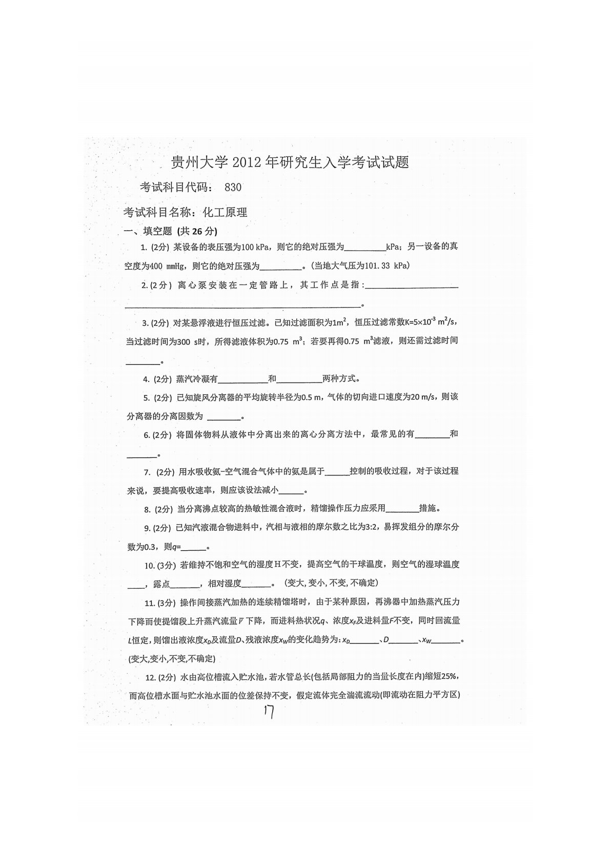 贵州大学830化工原理2012年真题
