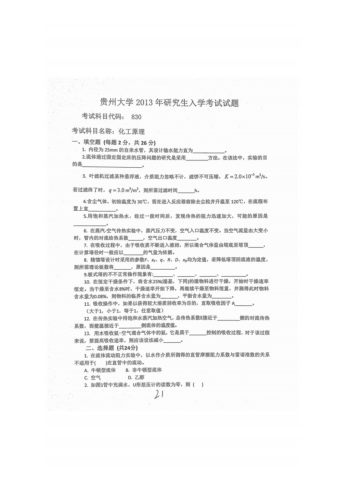 贵州大学830化工原理2013年真题