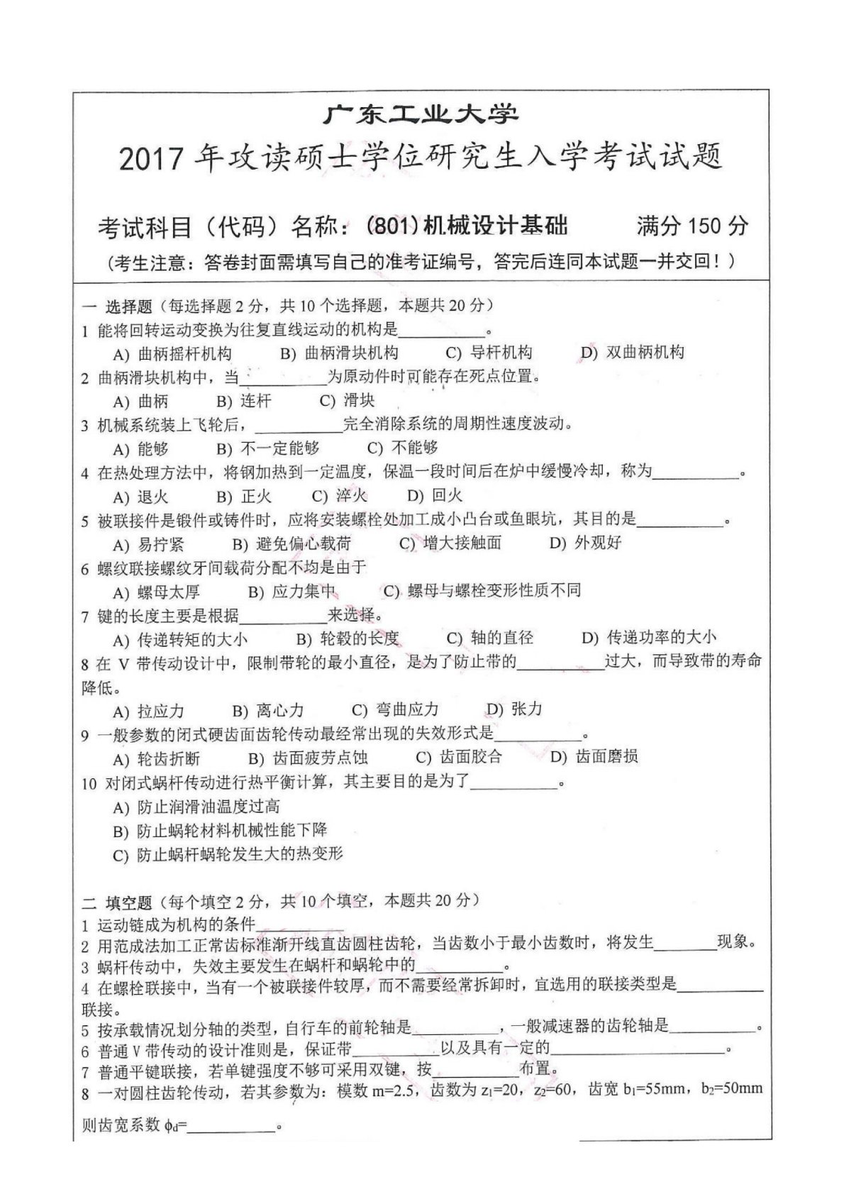广东工业大学801机械设计基础2017年考研真题