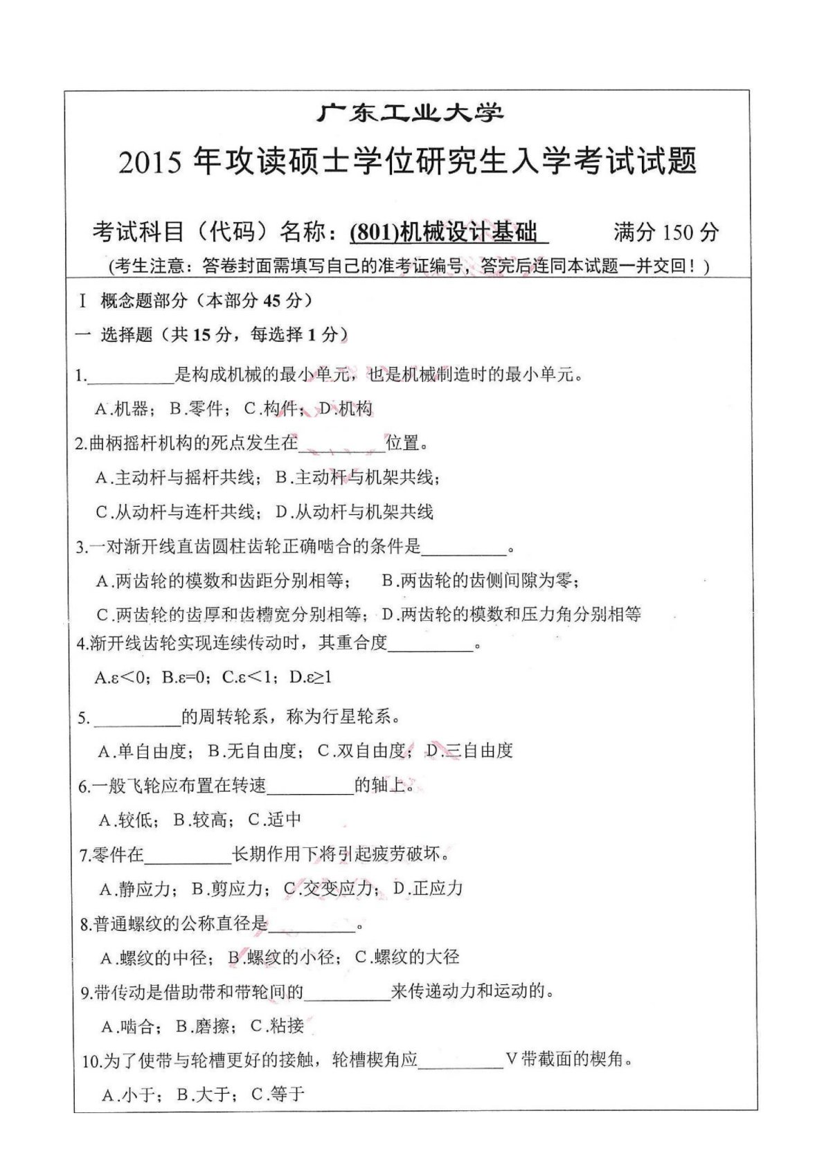 广东工业大学801机械设计基础2015年考研真题