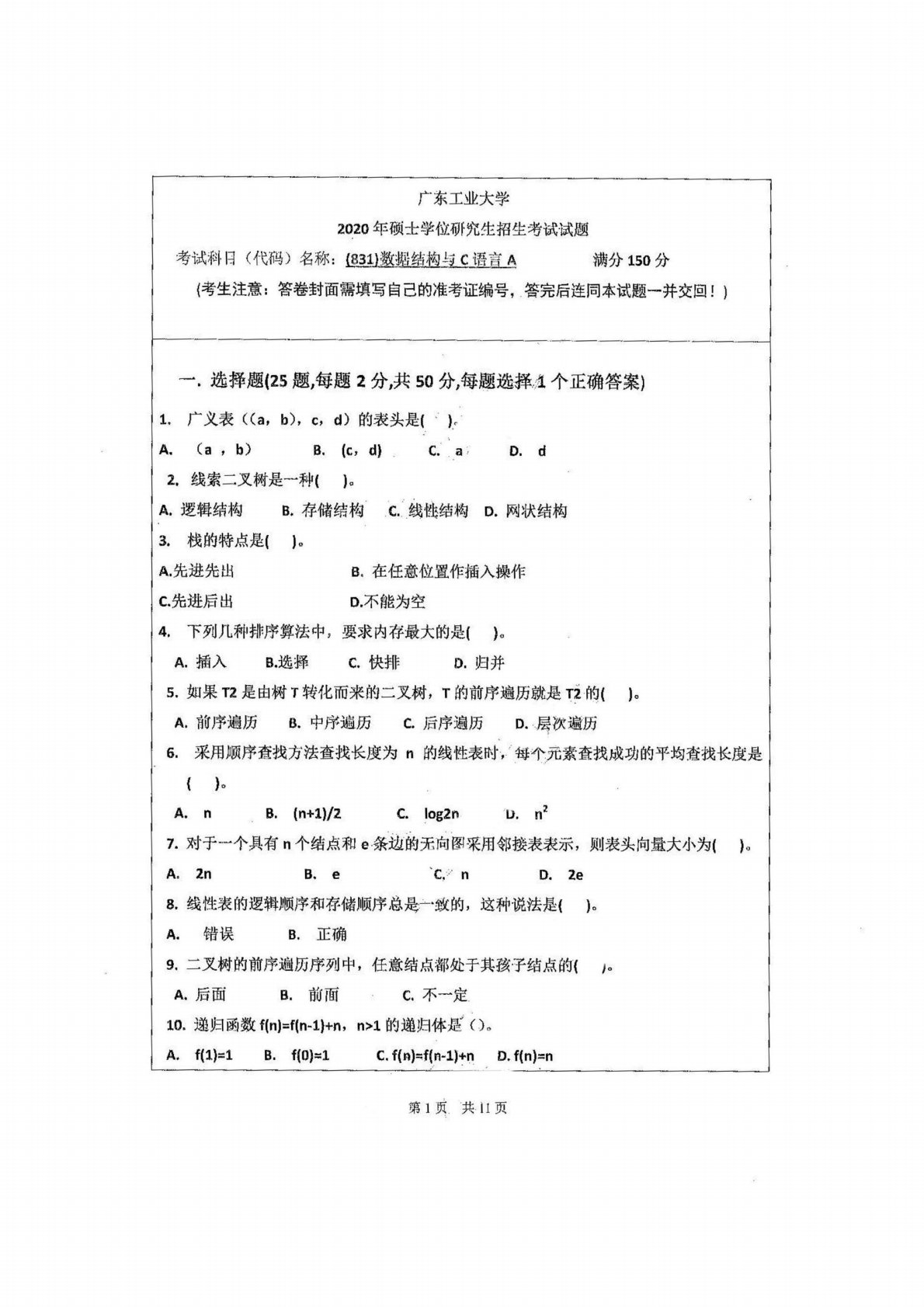 广东工业大学873C语言程序设计2020年真题