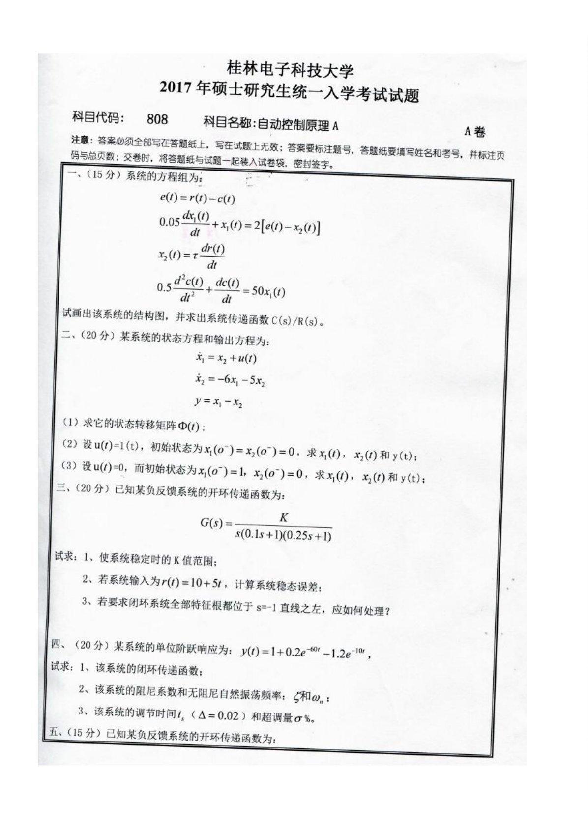 桂林电子科技大学2017年808自动控制原理考研真题
