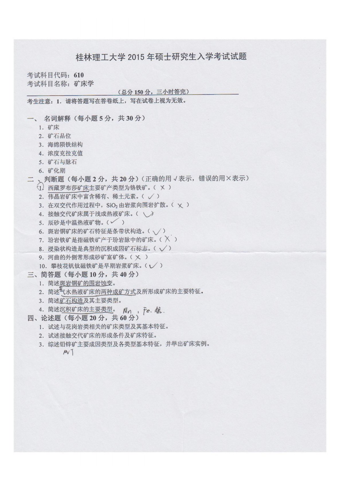 桂林理工大学610矿床学2015年真题