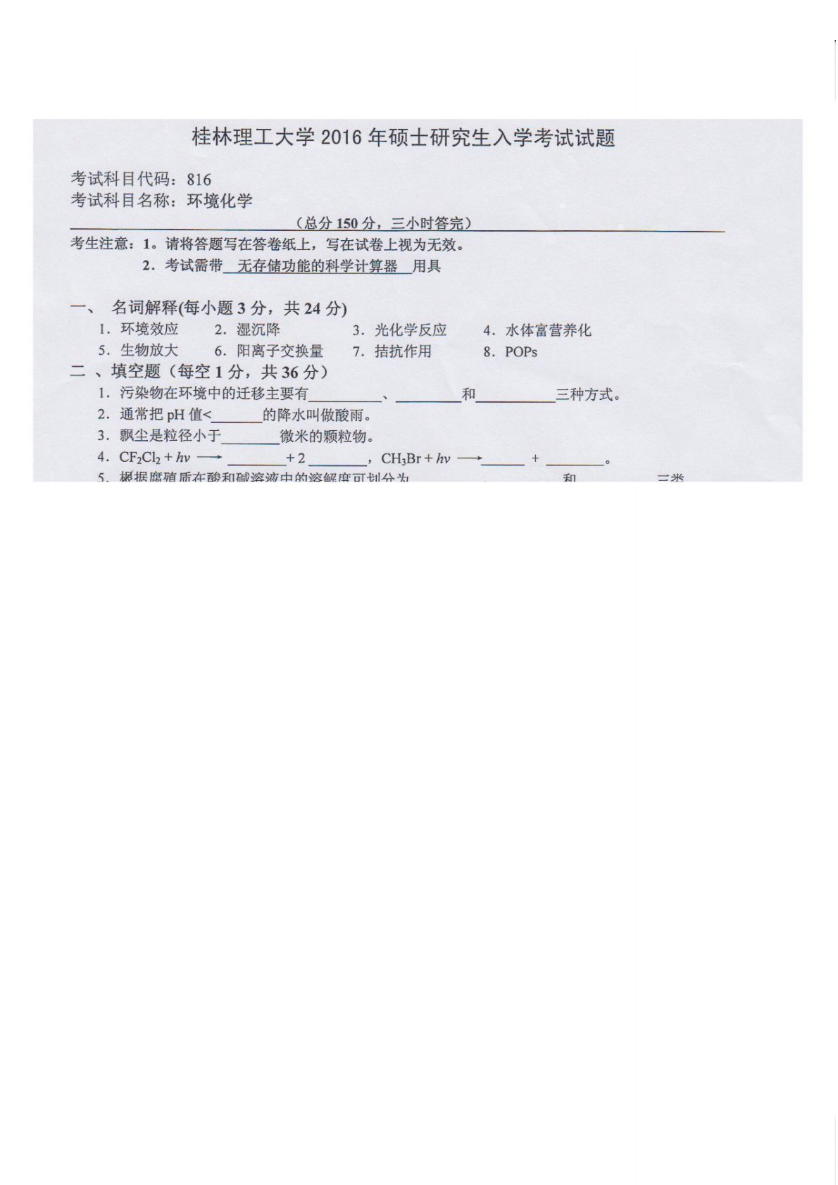 桂林理工大学816环境化学2016年真题