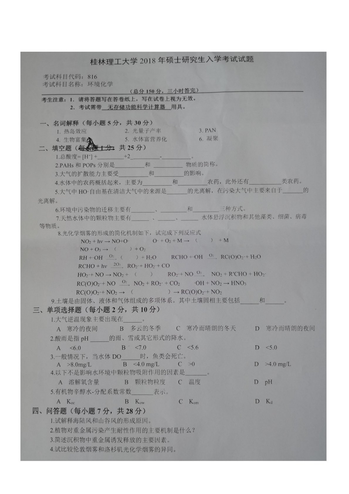 桂林理工大学816环境化学2018年真题