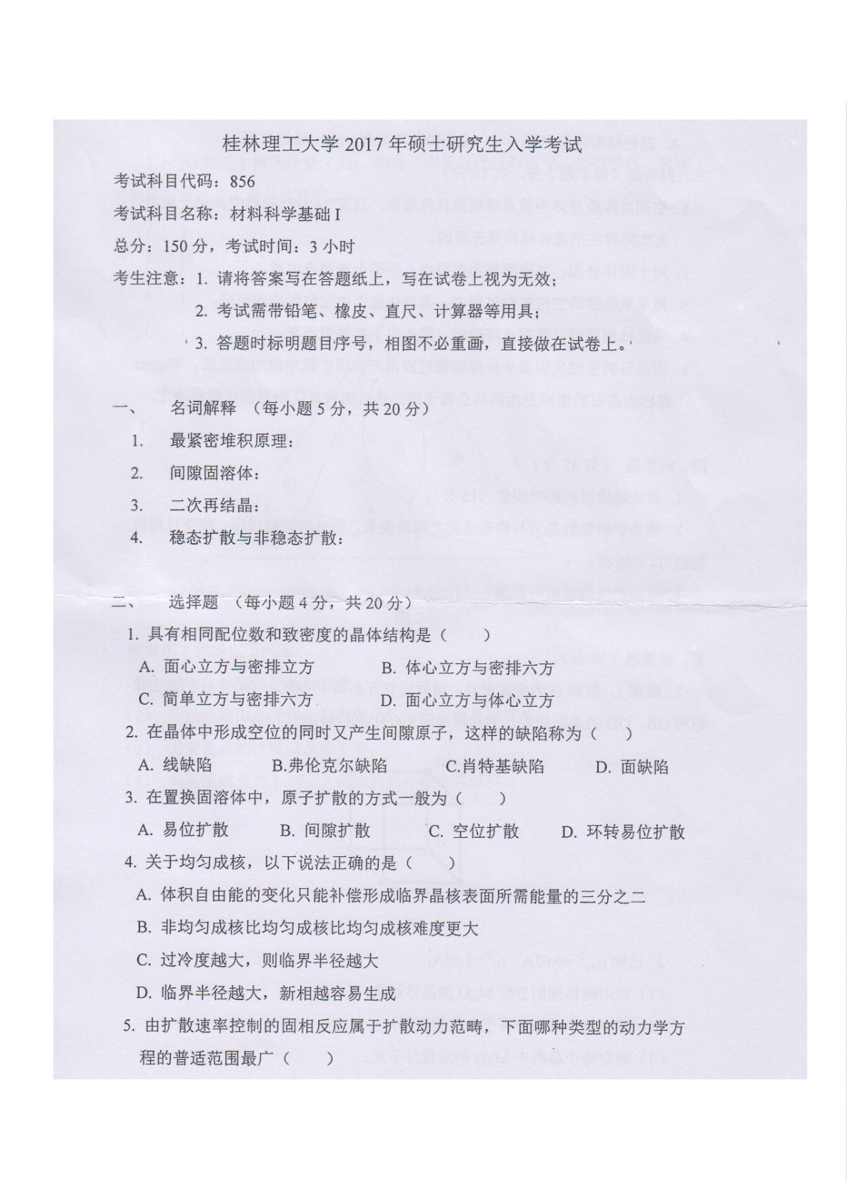 桂林理工大学856材料科学基础2017年真题