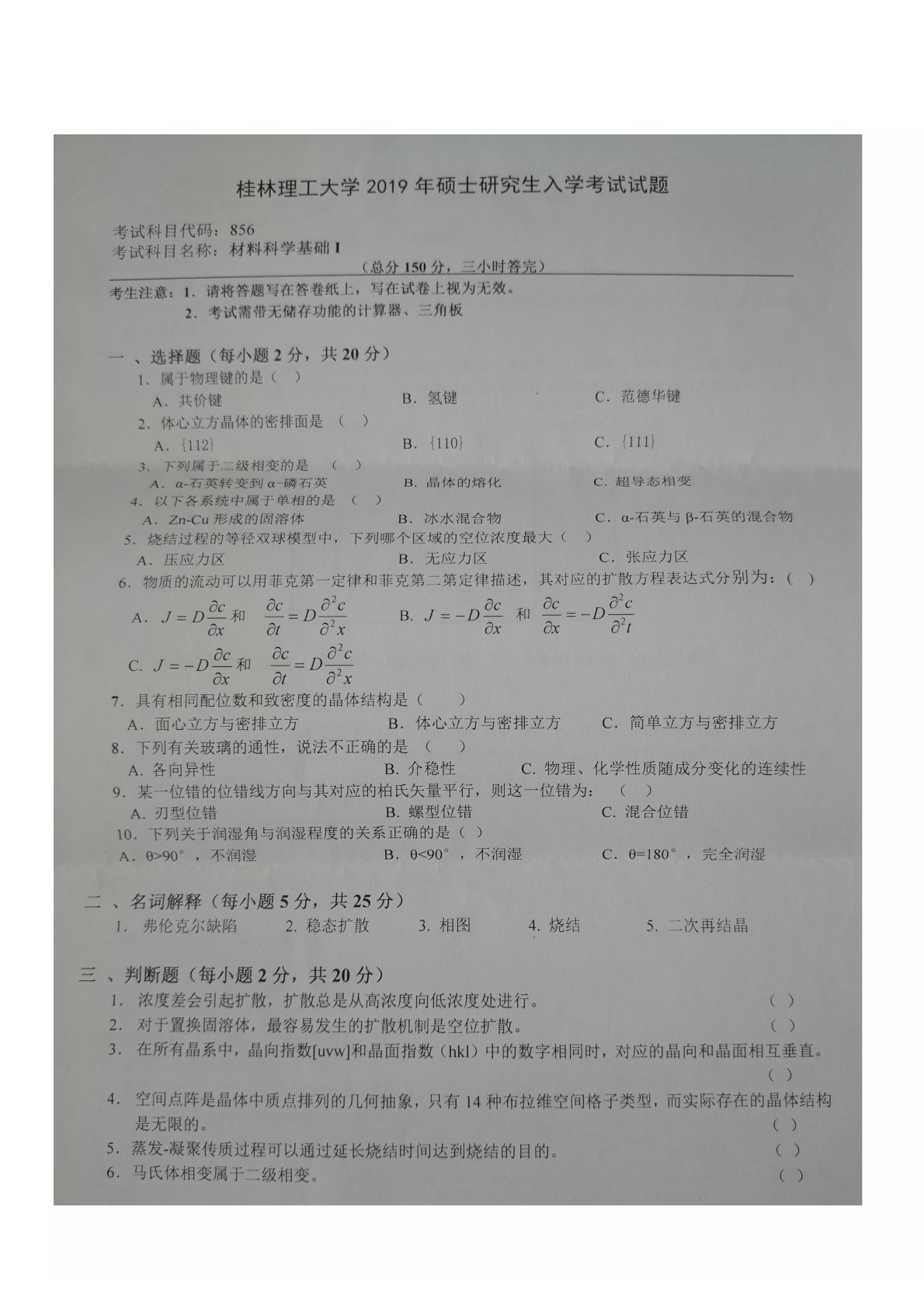 桂林理工大学856材料科学基础2019年真题