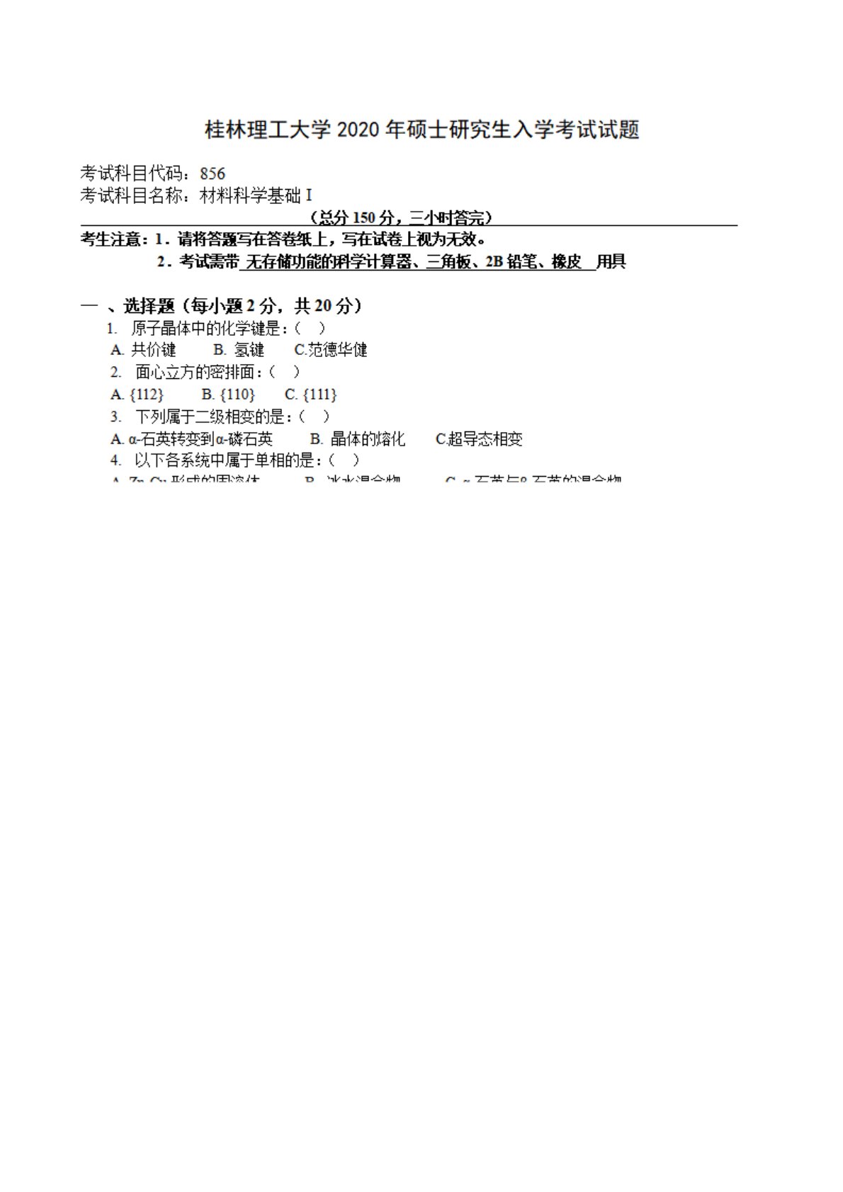 桂林理工大学856材料科学基础2020年真题