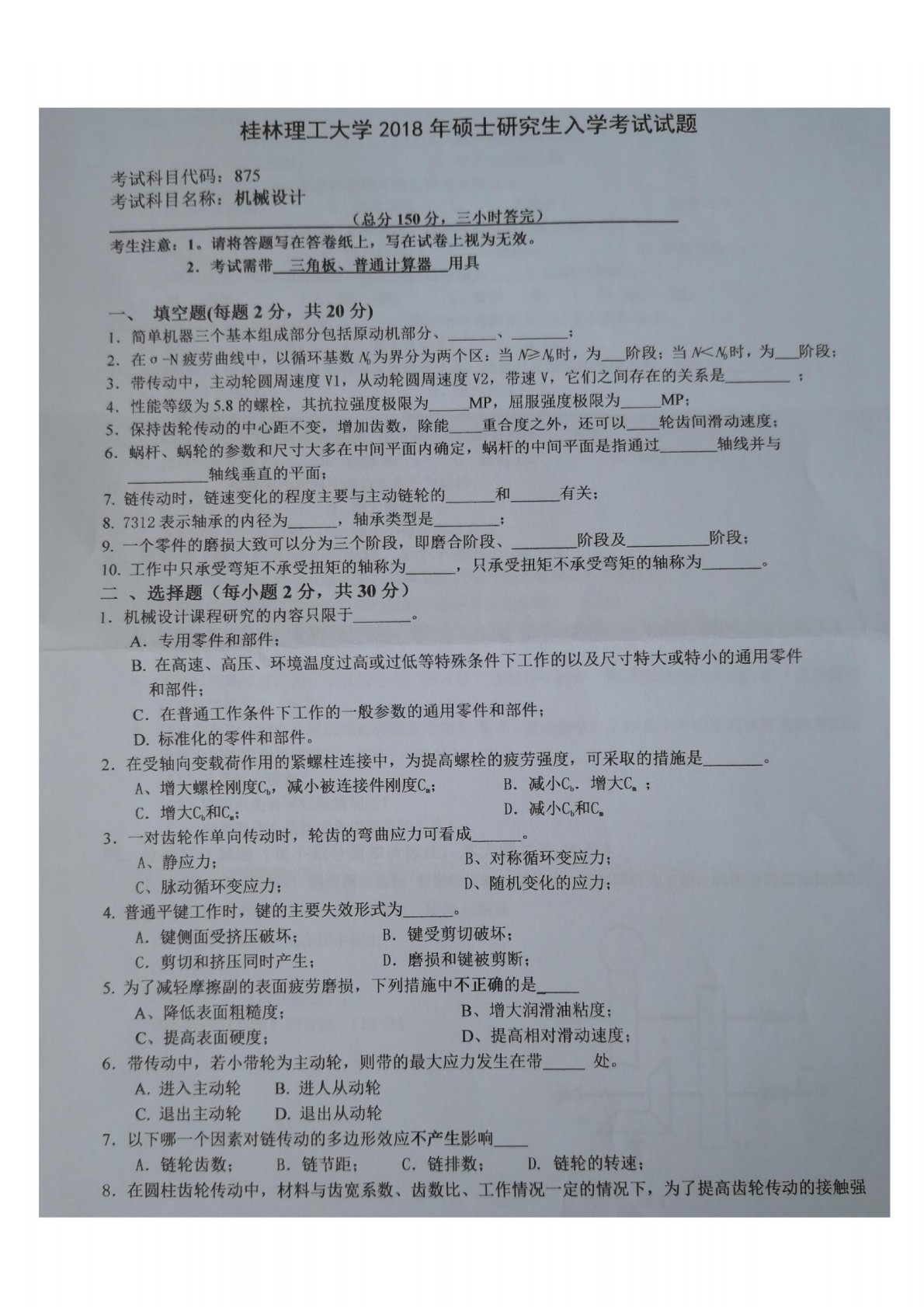 桂林理工大学871机械设计2018年真题