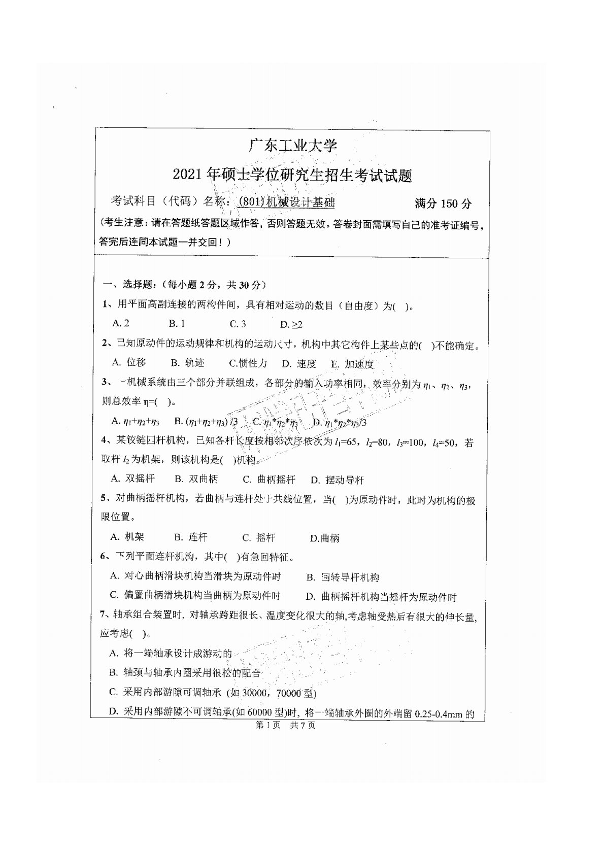 广东工业大学801机械设计基础2021年真题