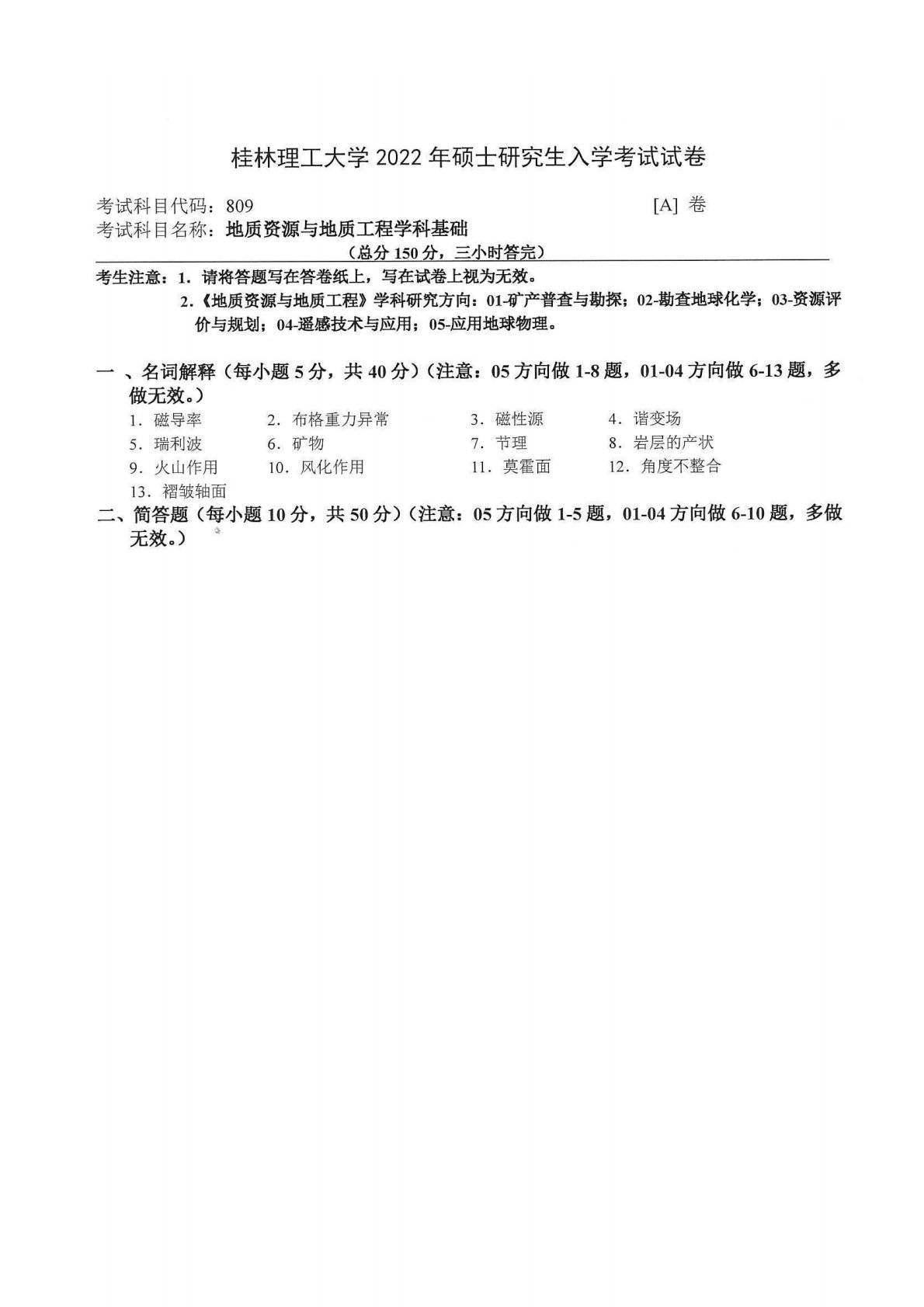 桂林理工大学809地质资源与地质工程学科基础2022年真题