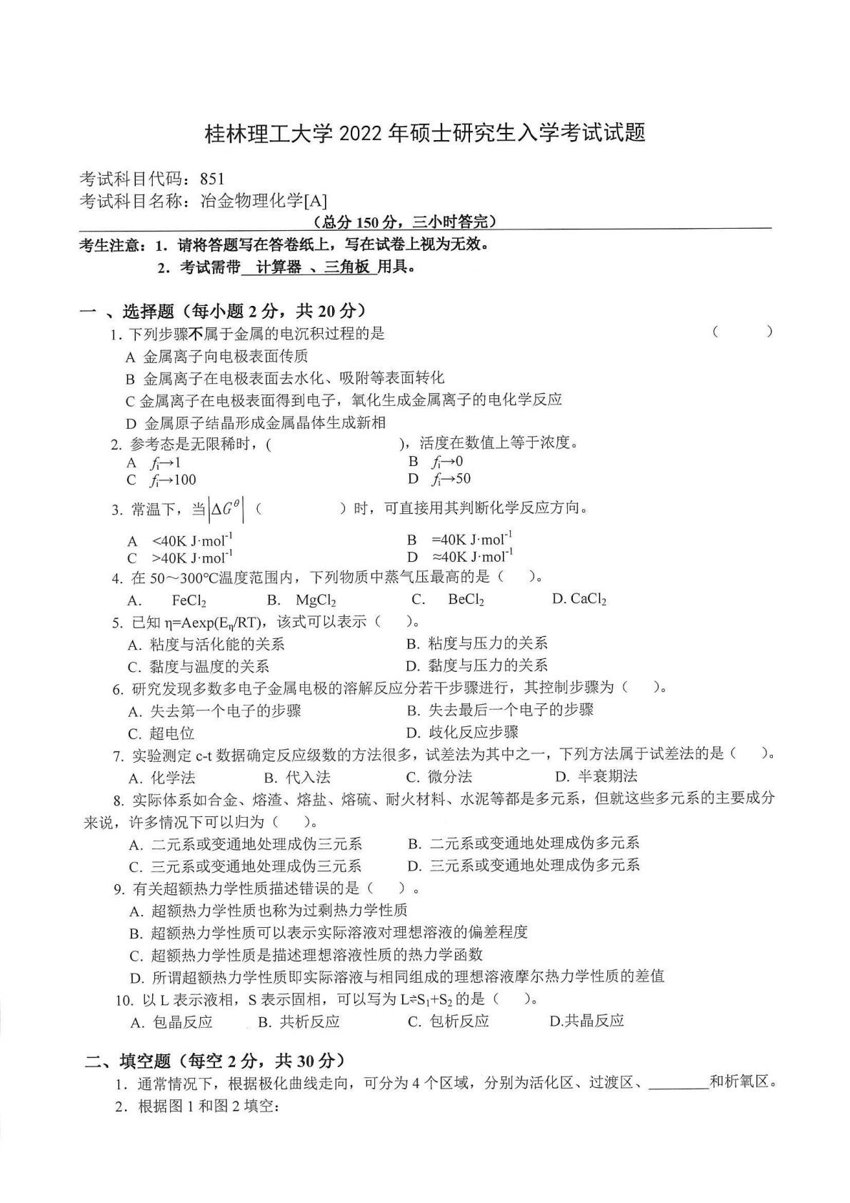 桂林理工大学851冶金物理化学2022年真题