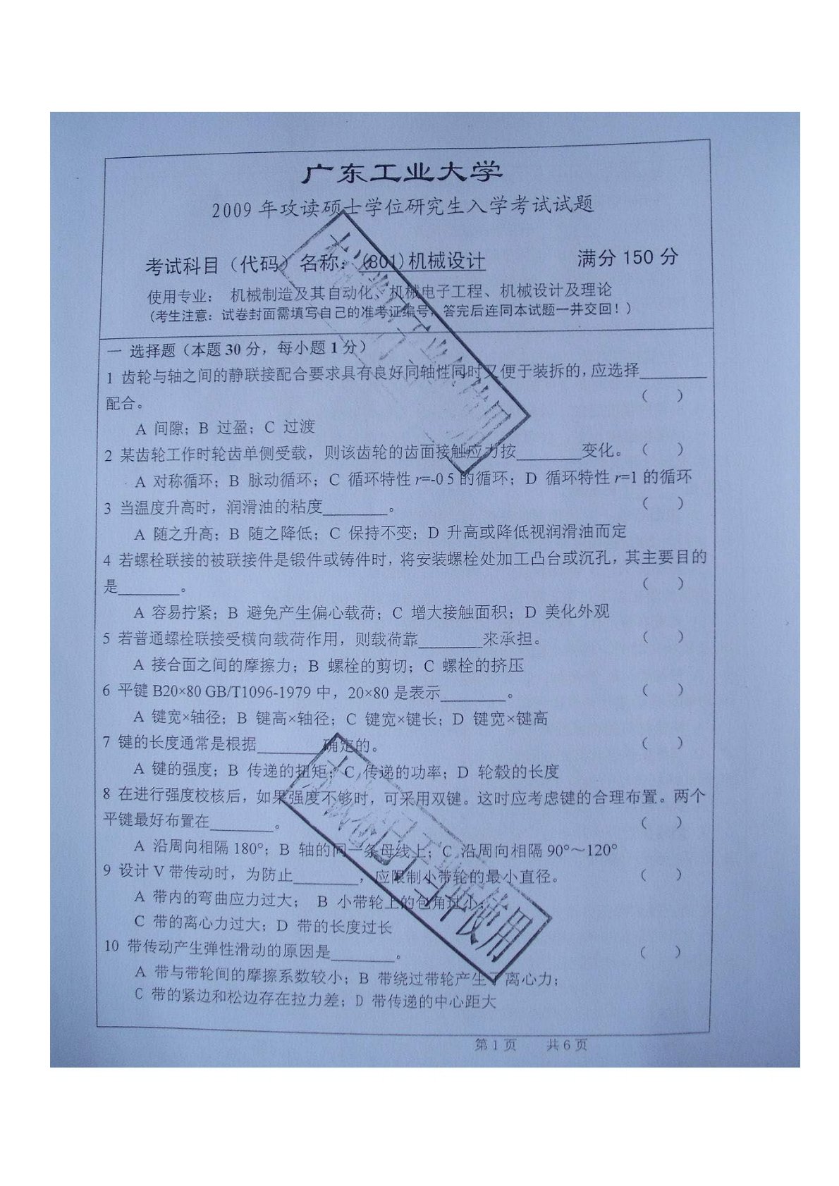 广东工业大学801机械设计基础2009年真题
