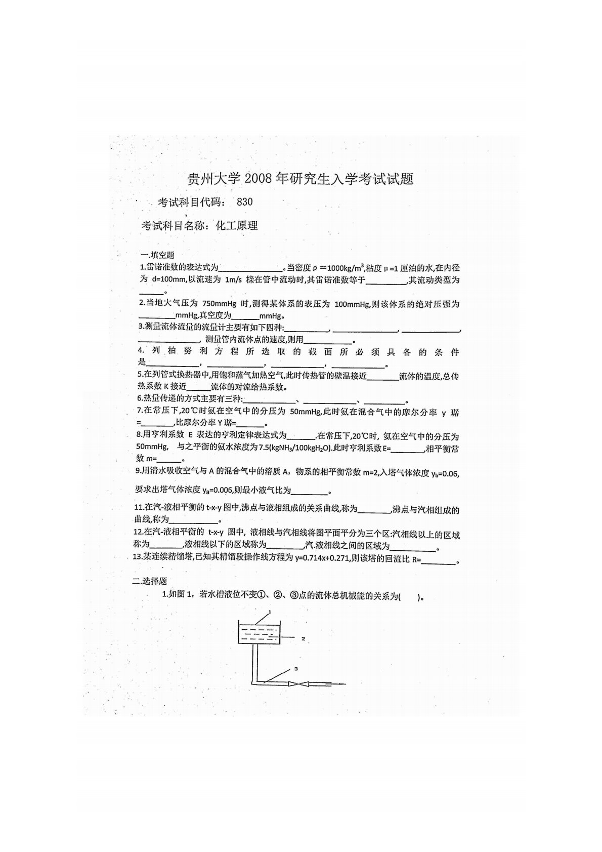 贵州大学830化工原理2008年真题