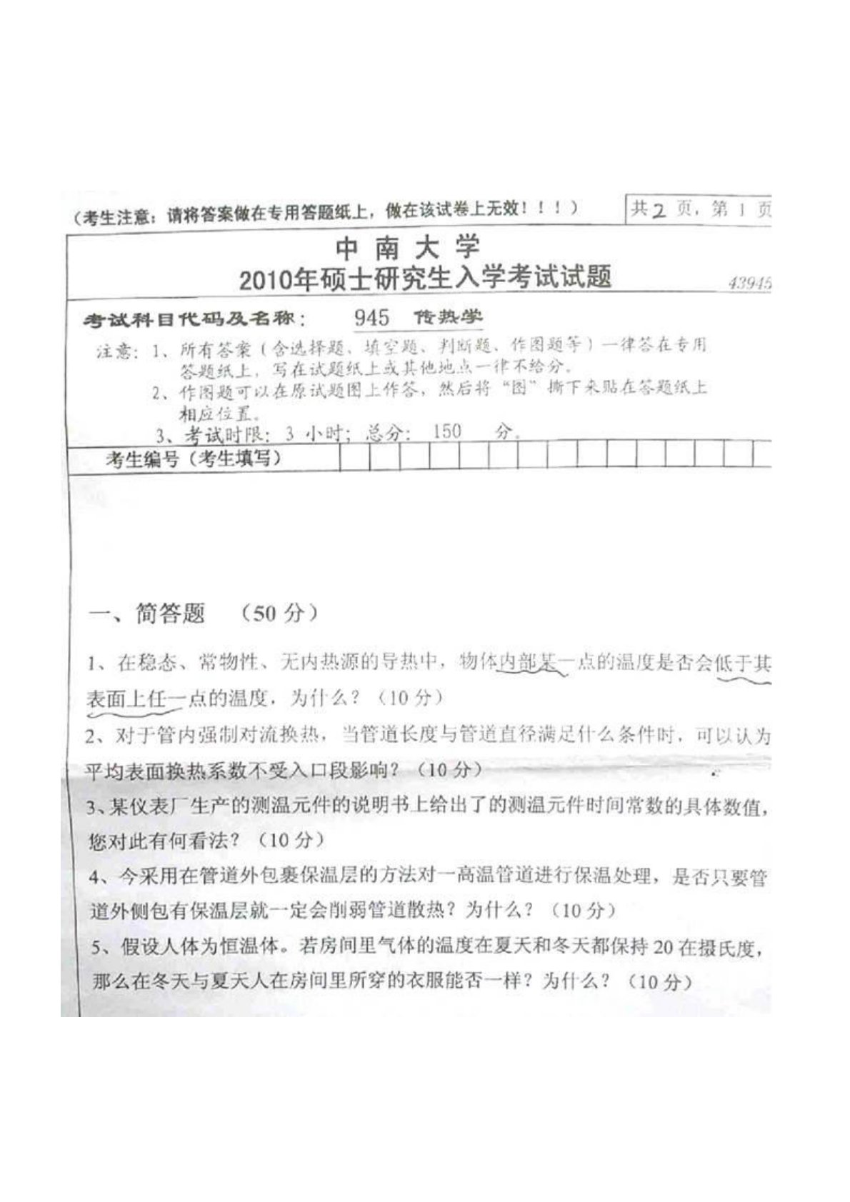 中南大学945传热学2010年真题
