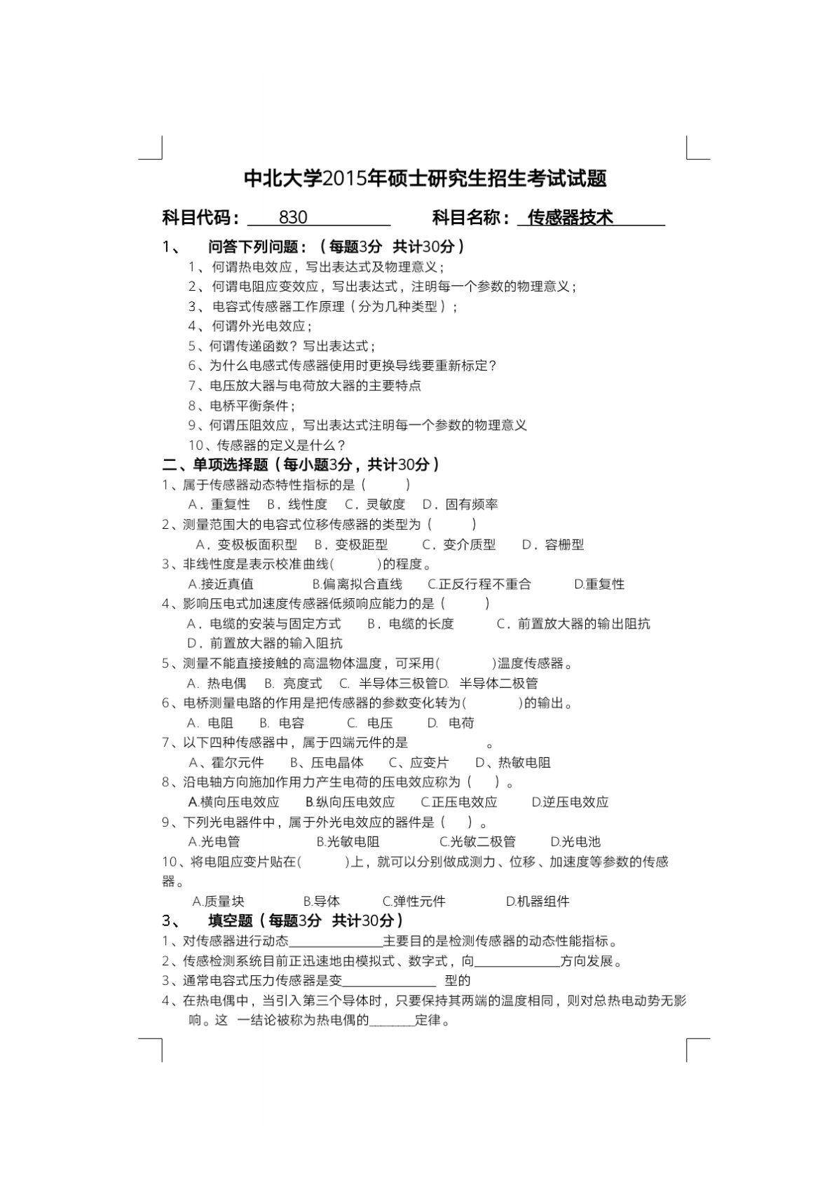 中北大学810传感器技术2015年真题