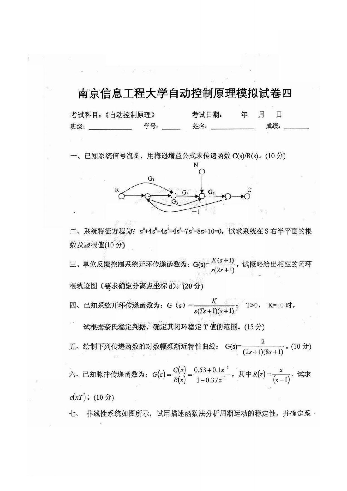 南京信息工程大学817自动控制原理模拟试卷四