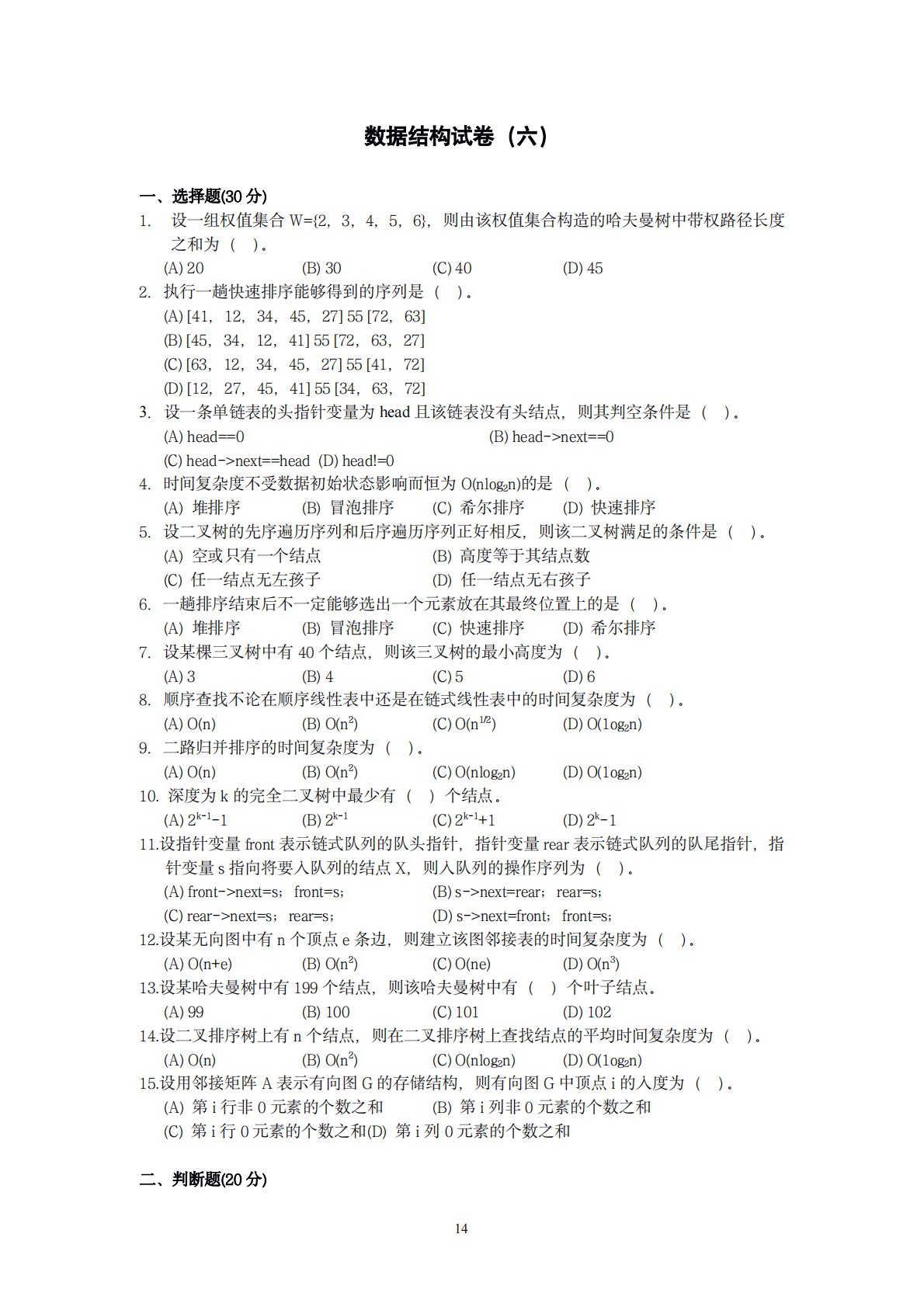 14数据结构试卷(六)一、选择题(30分)1.设一组权值集合W={2,3,4,5,6},则由该权值集合构造的哈夫曼树中带权路径长度之和为()。(A)20(B)30(C)40(D)452.执行一趟快速排序能够得到的序列是()。(A)[41,12,34,45,27]55[72,63](B)[45,34,12,41]55[72,63,27](C)[63,12,34,45,27]55[41,72](D)[12,27,45,41]55[34,63,72]3.设一条单链表的头指针变量为head且该链表没有头结点,则其判空条件是()。(A)head==0(B)head->next==0(C)head->ne...