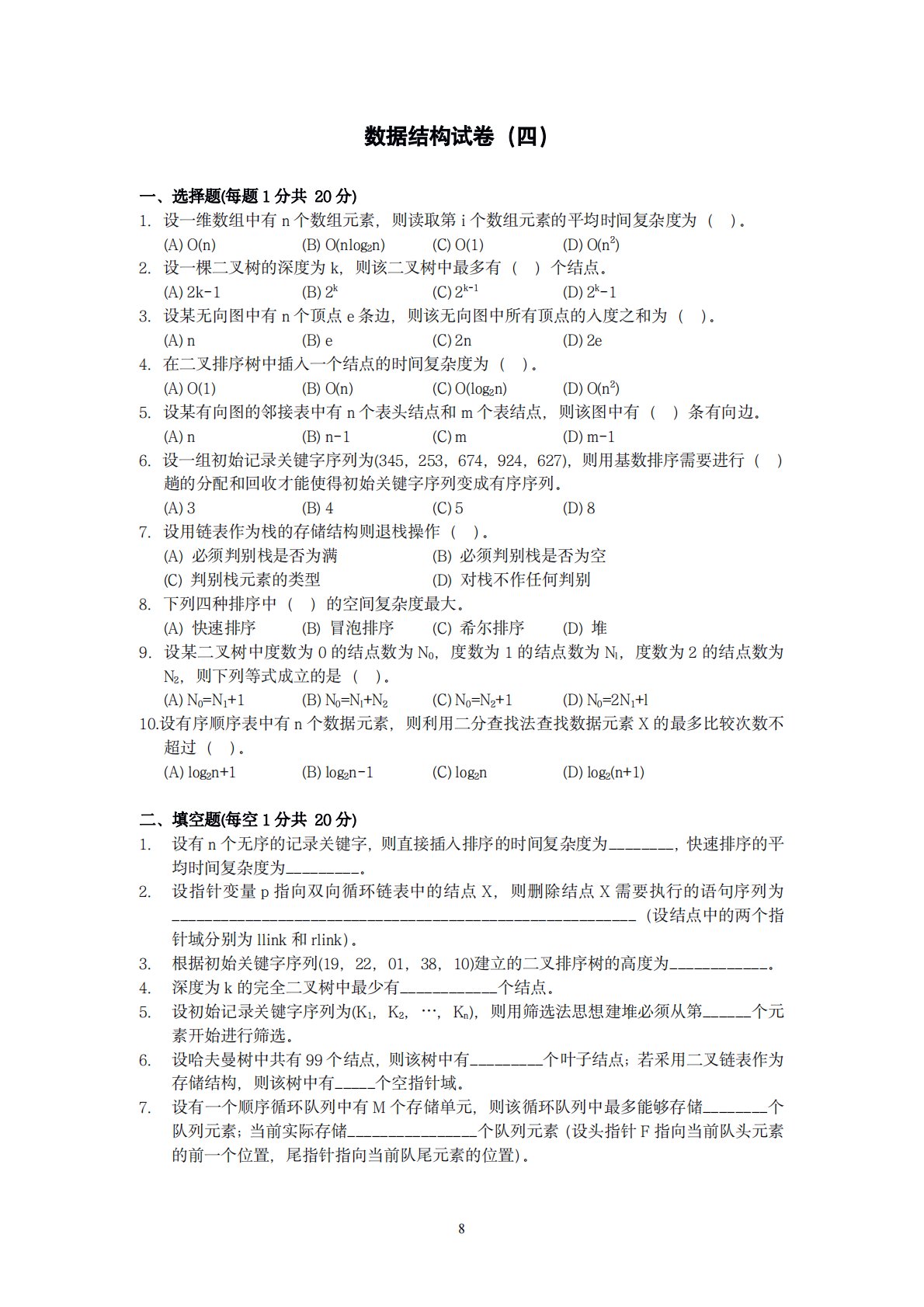8数据结构试卷(四)一、选择题(每题1分共20分)1.设一维数组中有n个数组元素,则读取第i个数组元素的平均时间复杂度为()。(A)O(n)(B)O(nlog2n)(C)O(1)(D)O(n2)2.设一棵二叉树的深度为k,则该二叉树中最多有()个结点。(A)2k-1(B)2k(C)2k-1(D)2k-13.设某无向图中有n个顶点e条边,则该无向图中所有顶点的入度之和为()。(A)n(B)e(C)2n(D)2e4.在二叉排序树中插入一个结点的时间复杂度为()。(A)O(1)(B)O(n)(C)O(log2n)(D)O(n2)5.设某有向图的邻接表中有n个表头结点和m个表结点,则该图中有()条有向...