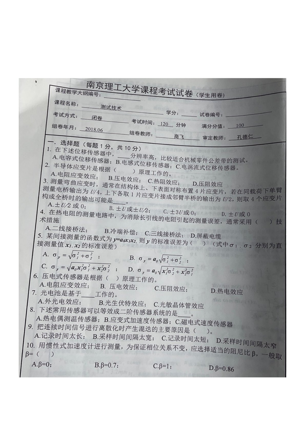 南京理工大学880信号与测控系统测试技术试卷1题目