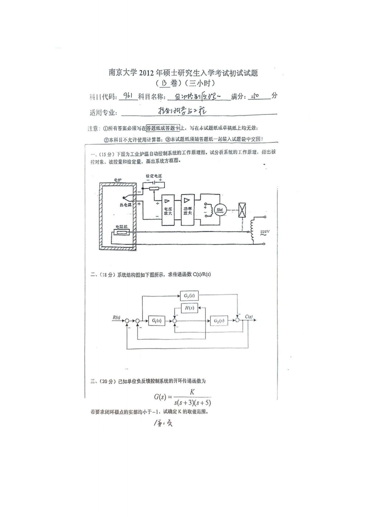 南京大学961自动控制原理(经典60%、现代40%)2012年真题