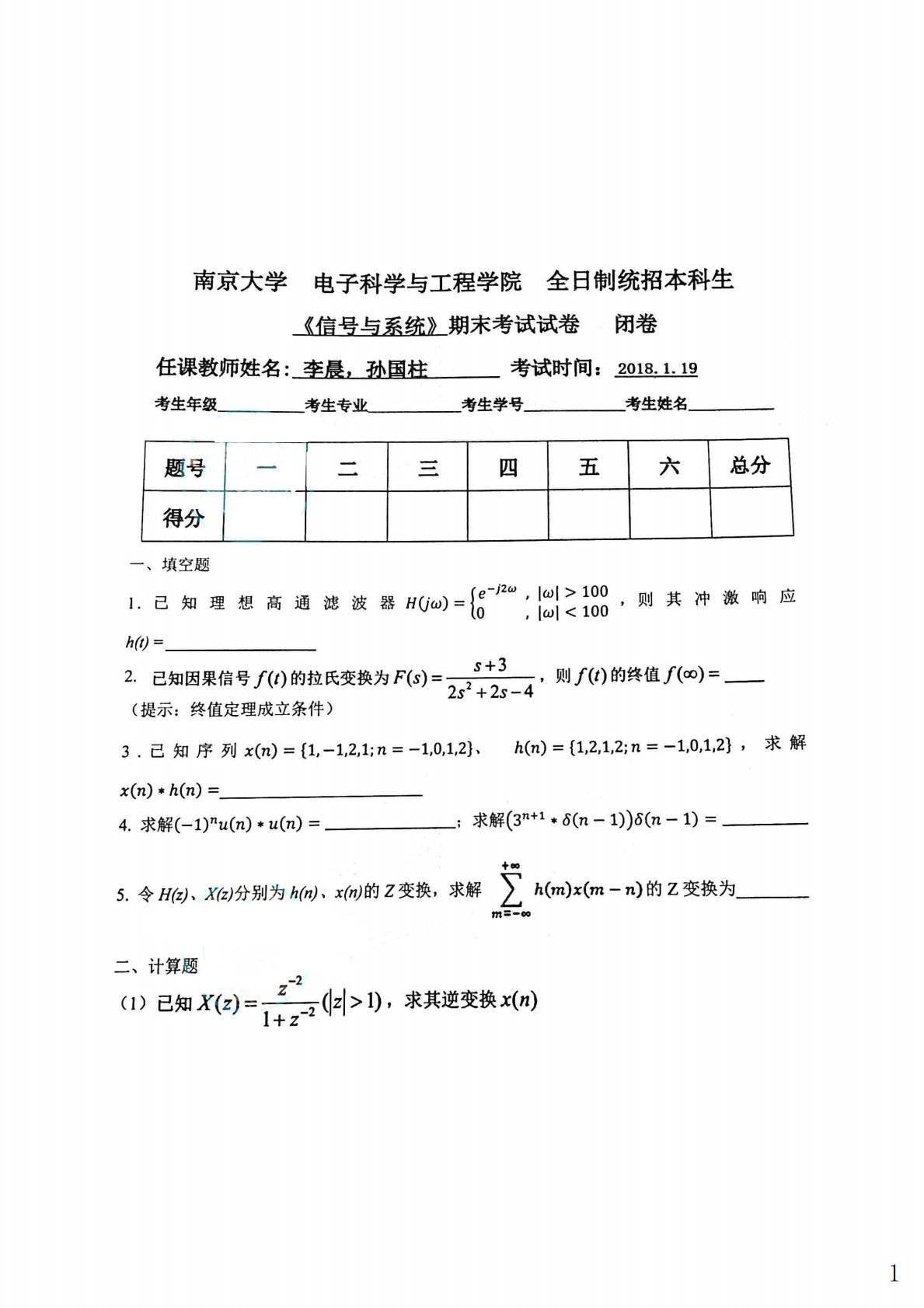 南京大学851信号与系统2017-2018学年期末试题
