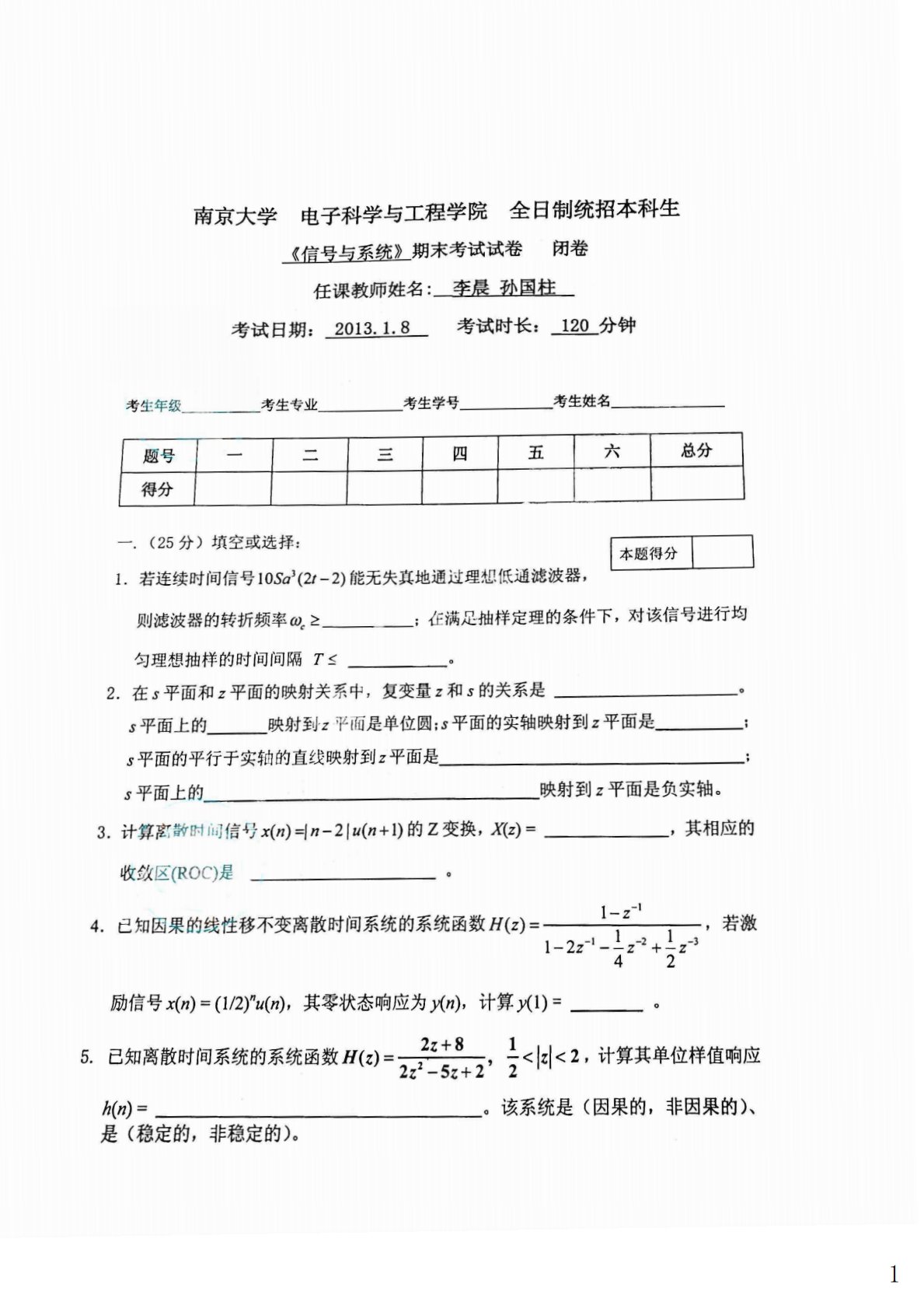 南京大学851信号与系统2012-2013学年期末试题