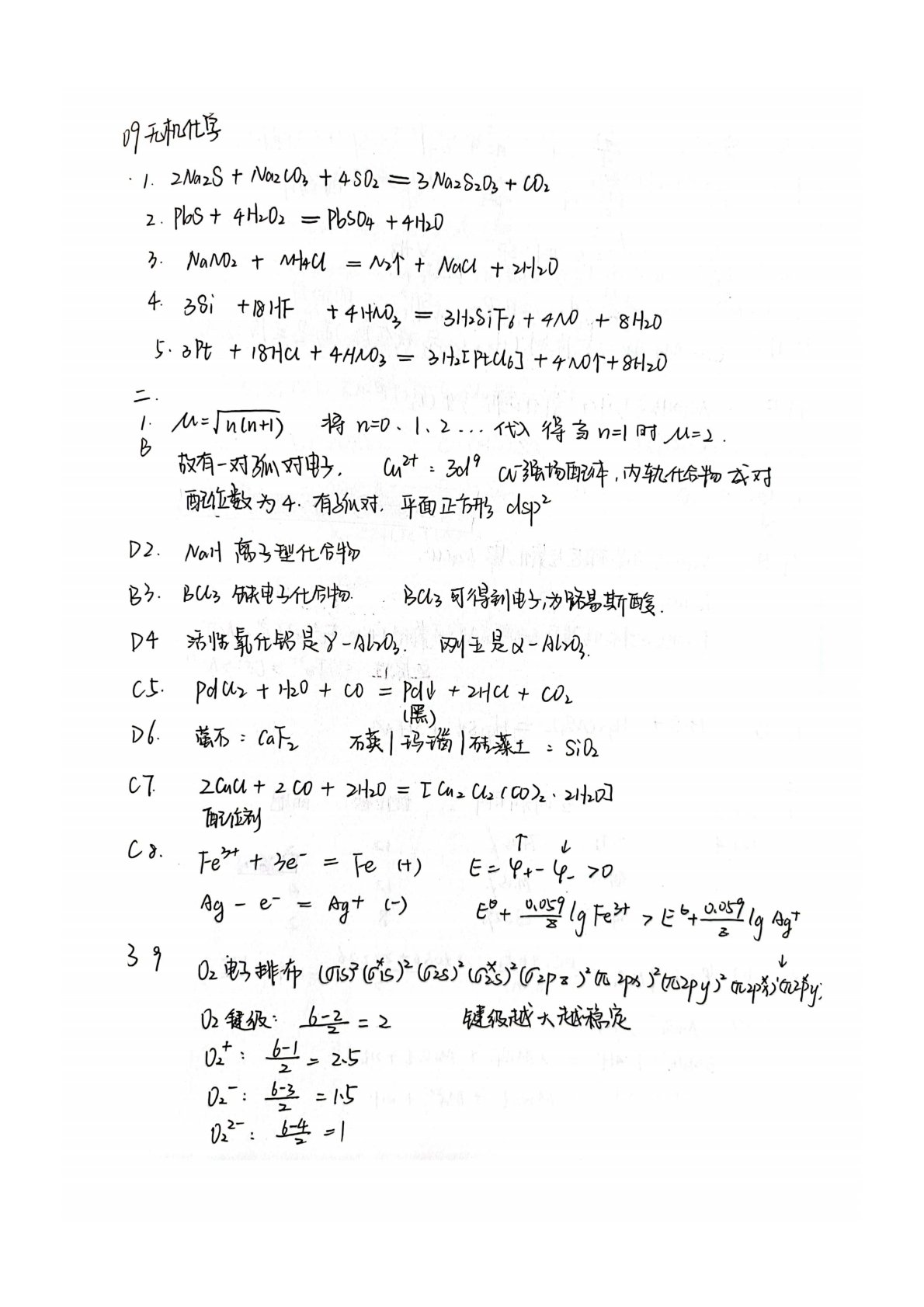 内蒙古大学671化学专业综合一无机化学2009年真题答案手写版