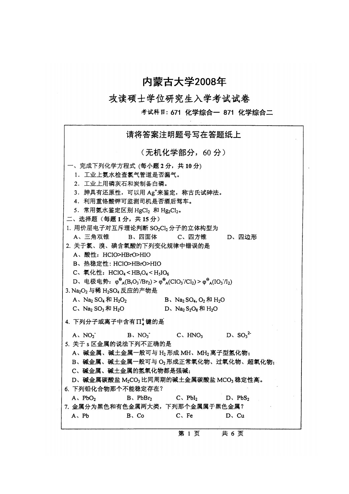 内蒙古大学671化学专业综合一2008年真题