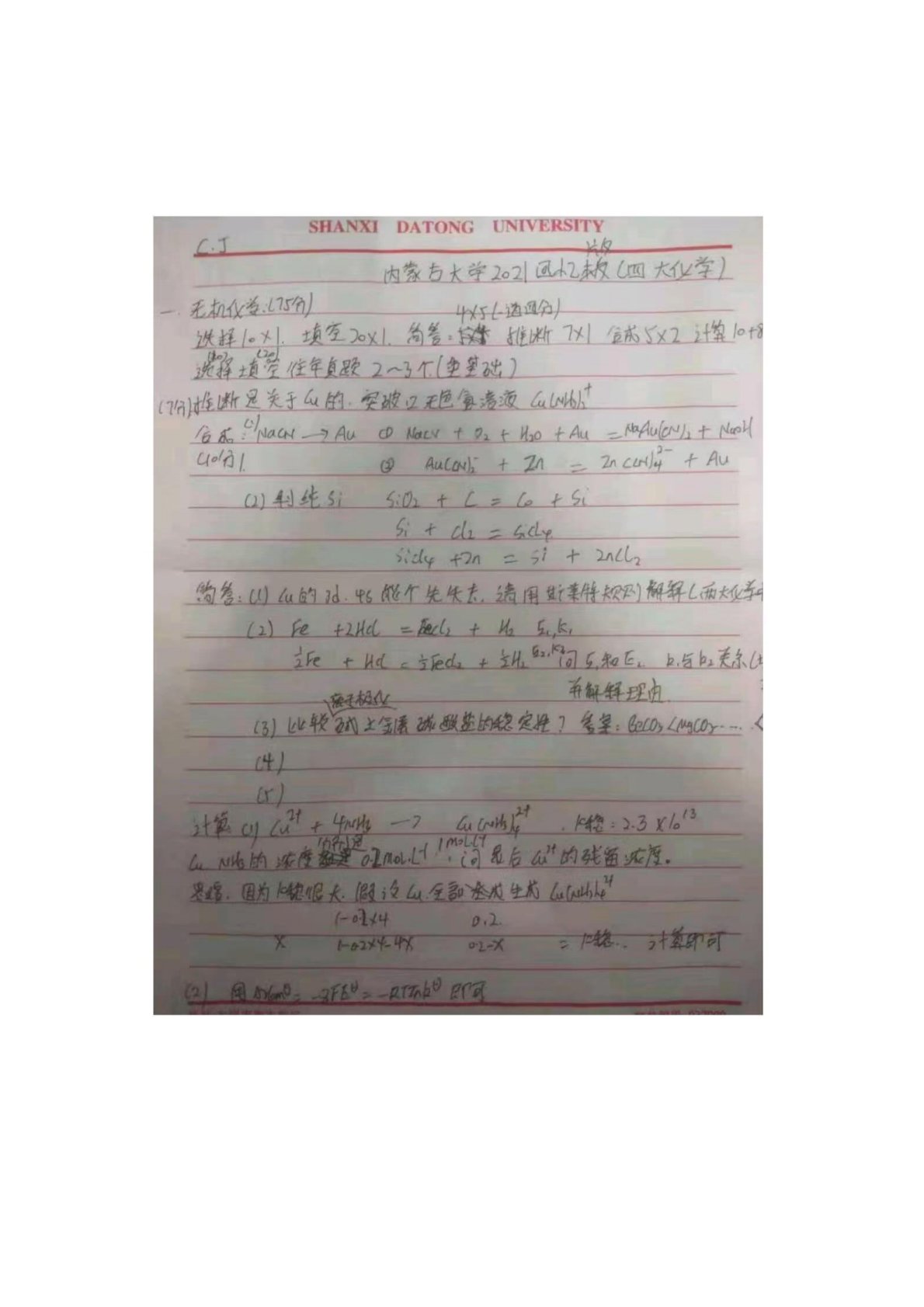 内蒙古大学671化学专业综合一2021年真题回忆手写版
