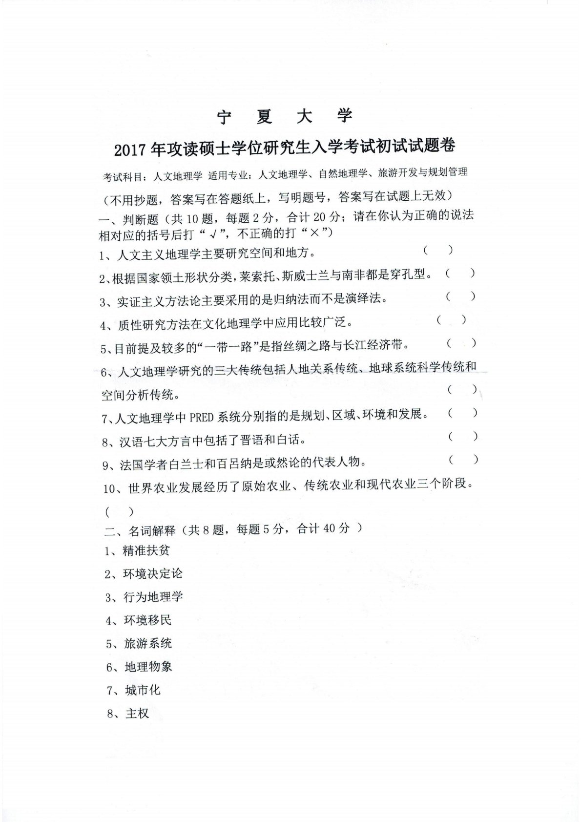 宁夏大学825地理综合2017年真题(人文地理)