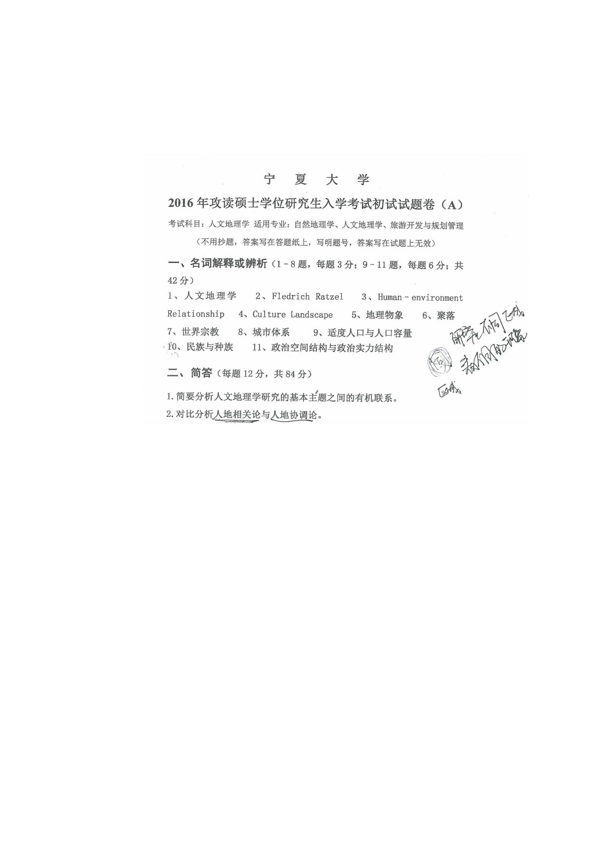 宁夏大学825地理综合2016年真题(人文地理)