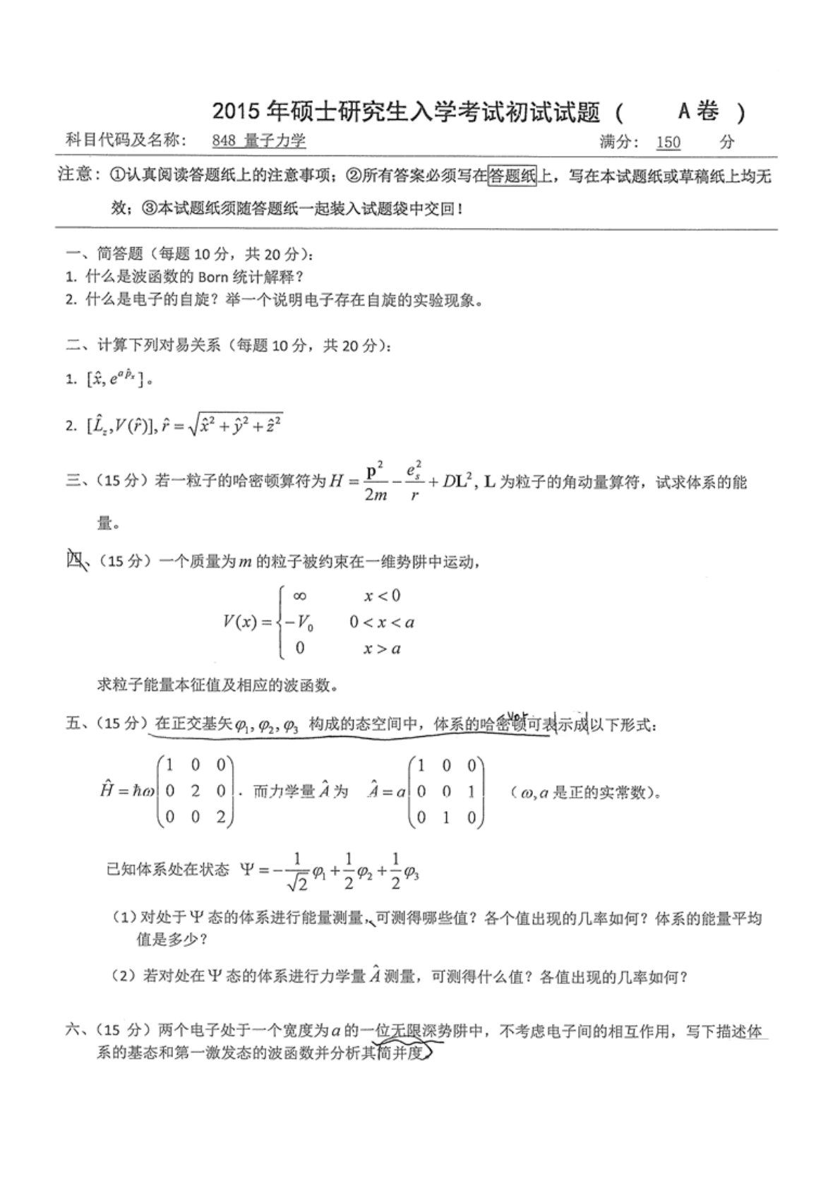 南京师范大学833量子力学2015年真题