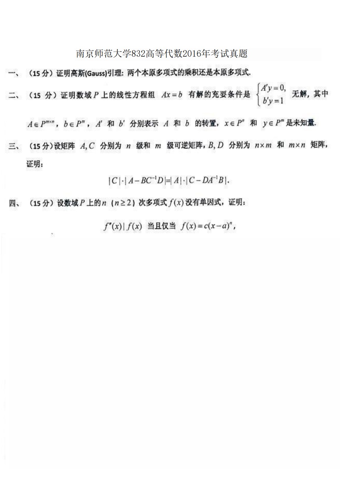 南京师范大学832高等代数2016年考试真题