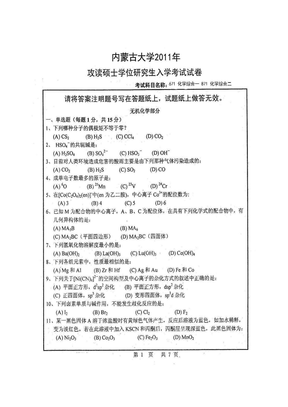 内蒙古大学671化学专业综合一2011年真题