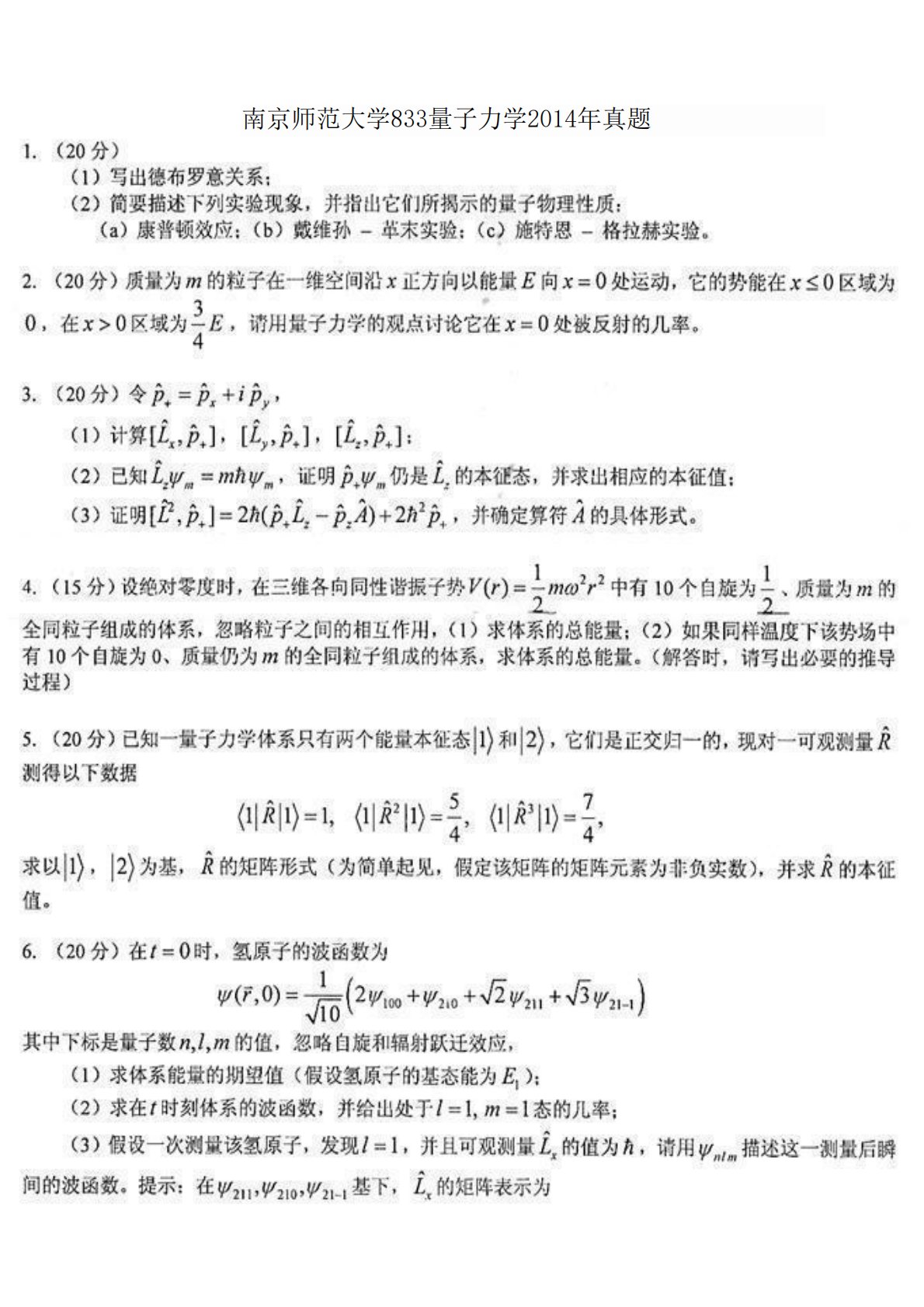 南京师范大学833量子力学2014年真题