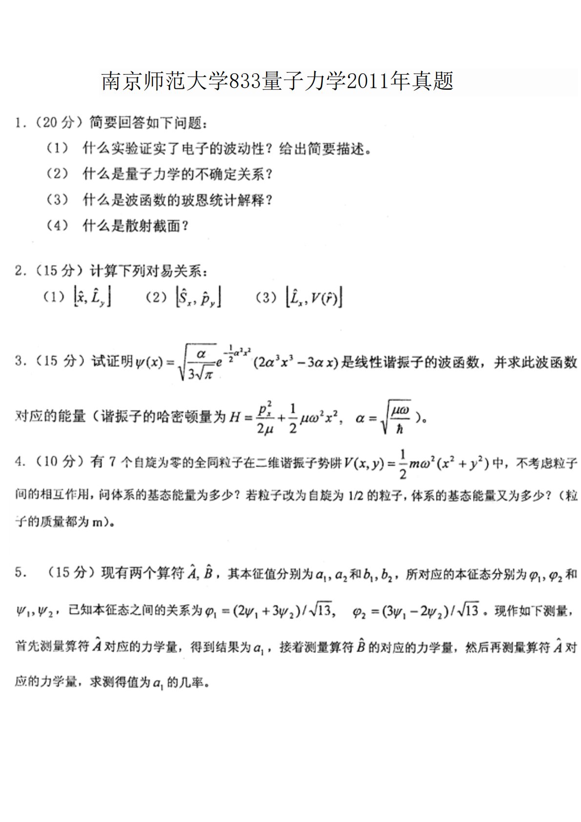南京师范大学833量子力学2011年真题