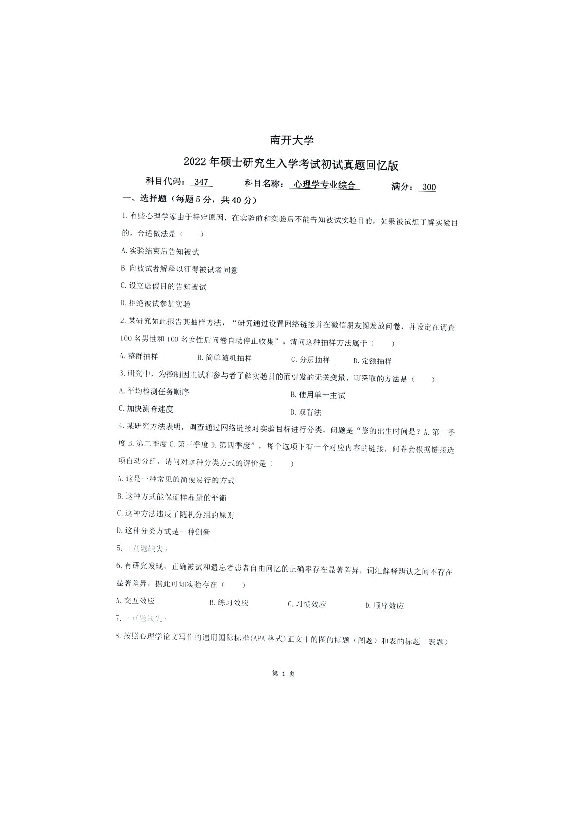南开大学347心理学专业综合2022年真题回忆版