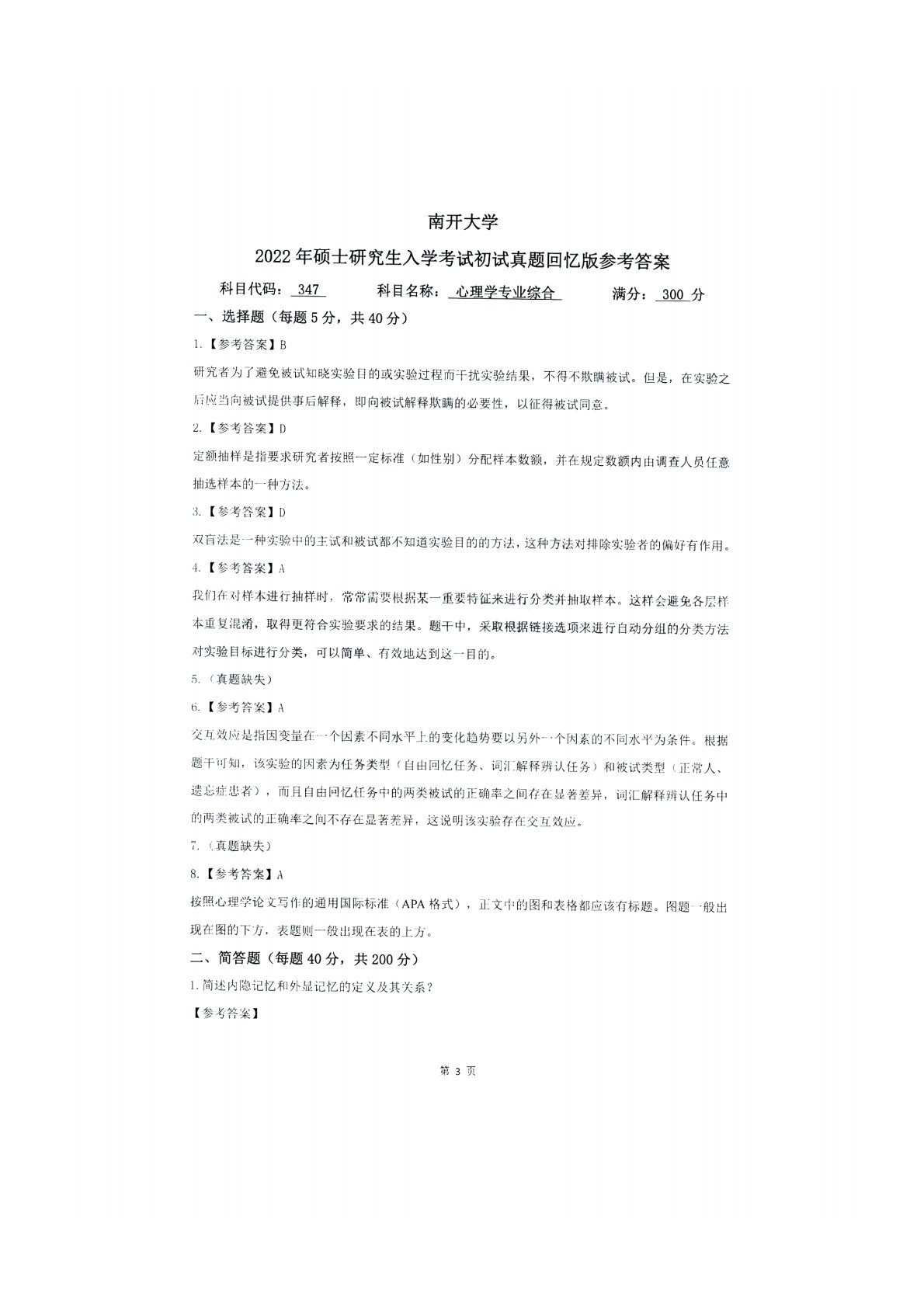 南开大学347心理学专业综合2022年真题答案回忆版