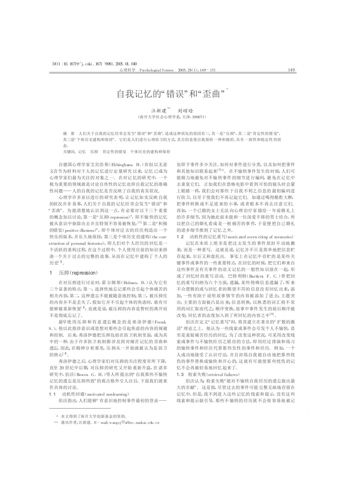 南开大学347心理学专业综合自我记忆的错误和歪曲