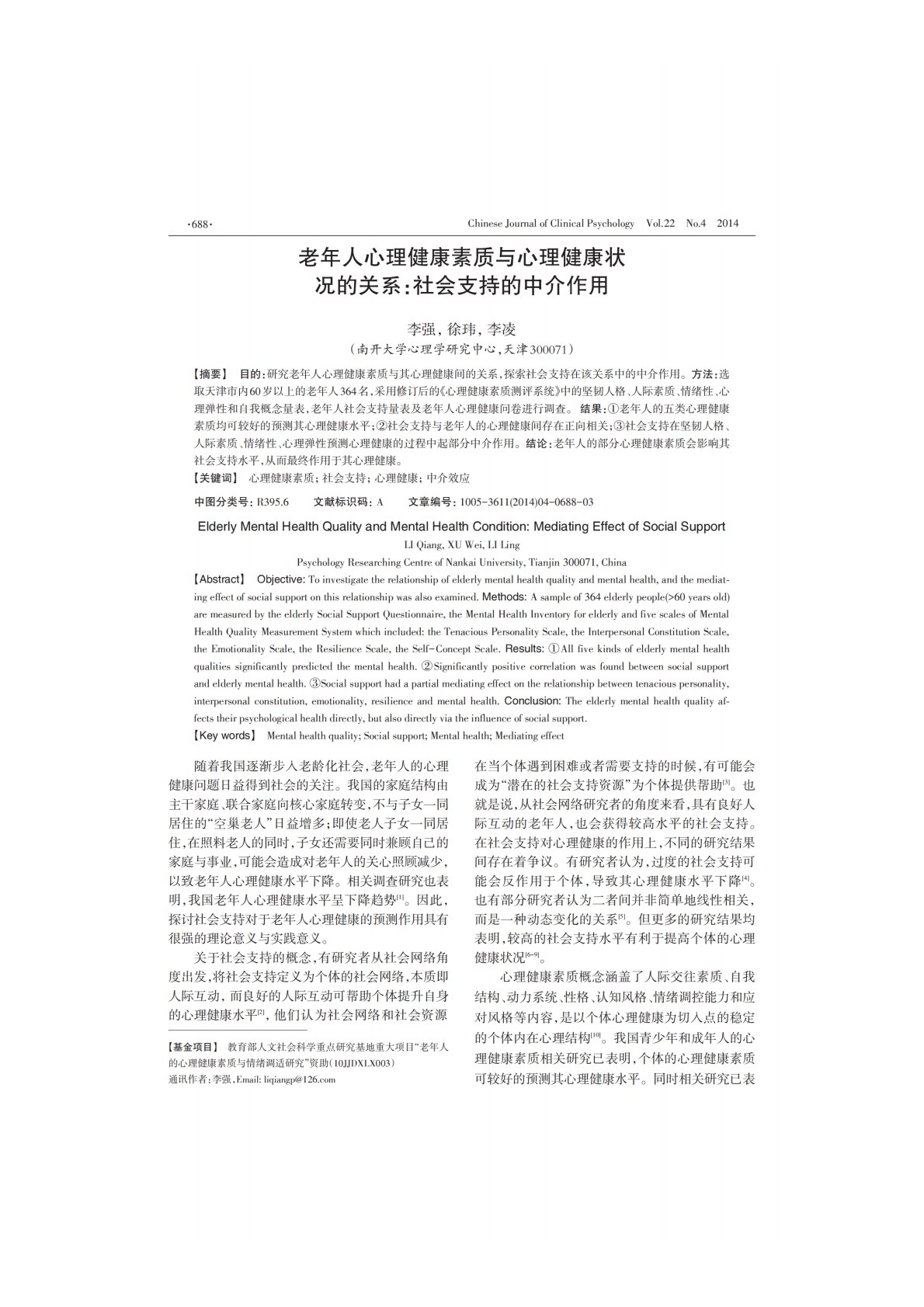 南开大学347心理学专业综合老年人心理健康素质与心理健康状况的关系社会支持的中介作用
