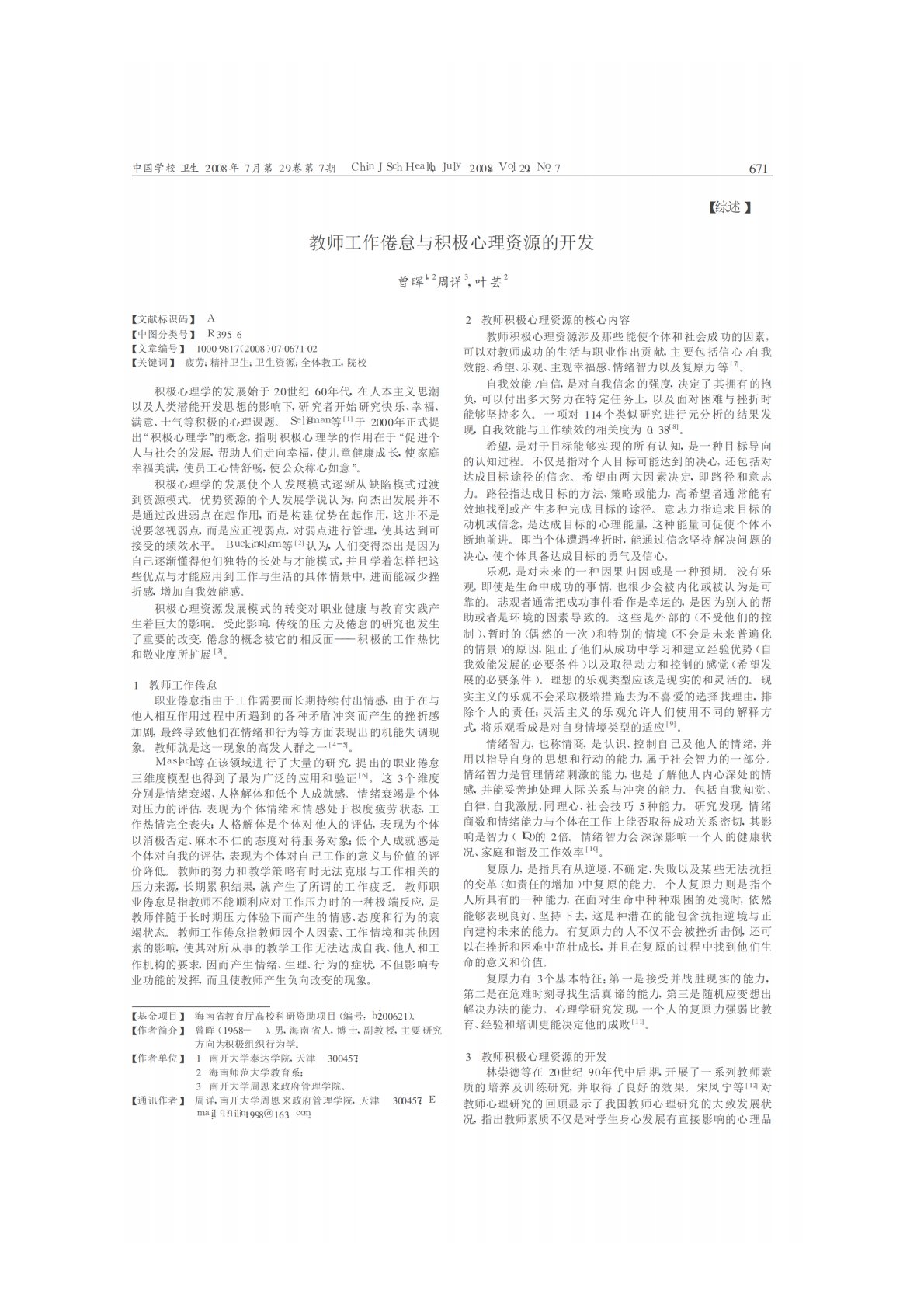南开大学347心理学专业综合教师工作倦怠与积极心理资源的开发