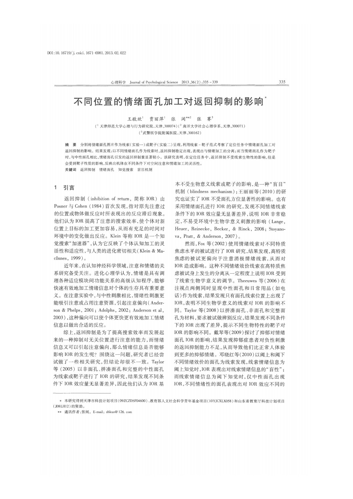 南开大学347心理学专业综合不同位置的情绪面孔加工对返回抑制的影响